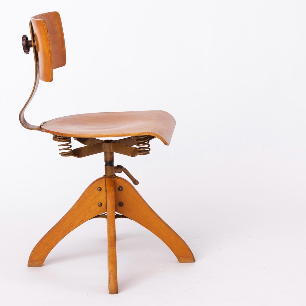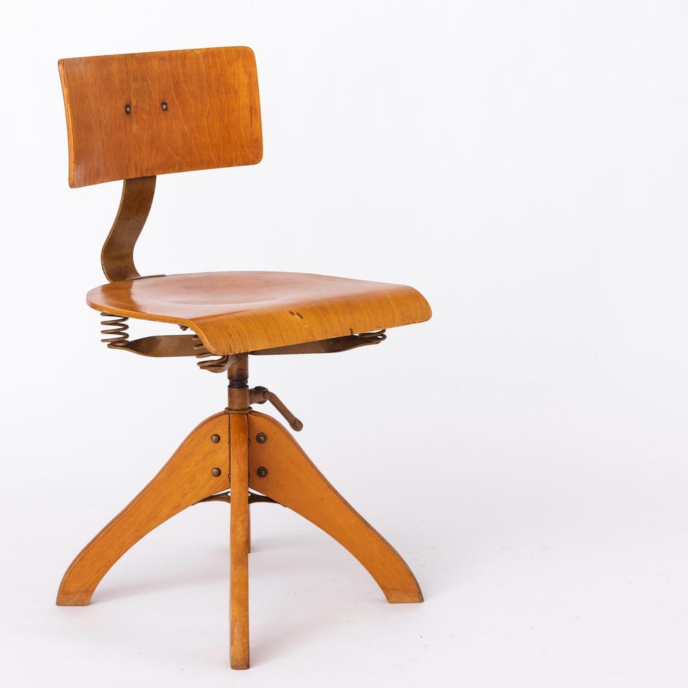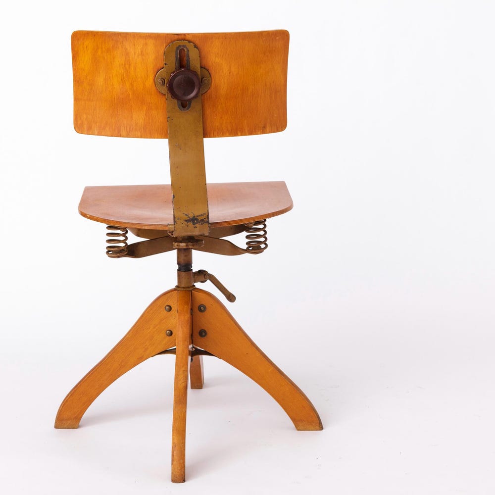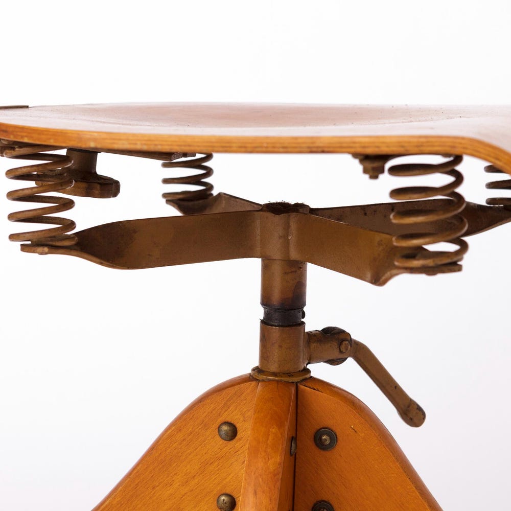 Vintage 1950s Industrial Chair – Adjustable German Factory Stool, Beech Wood Frame