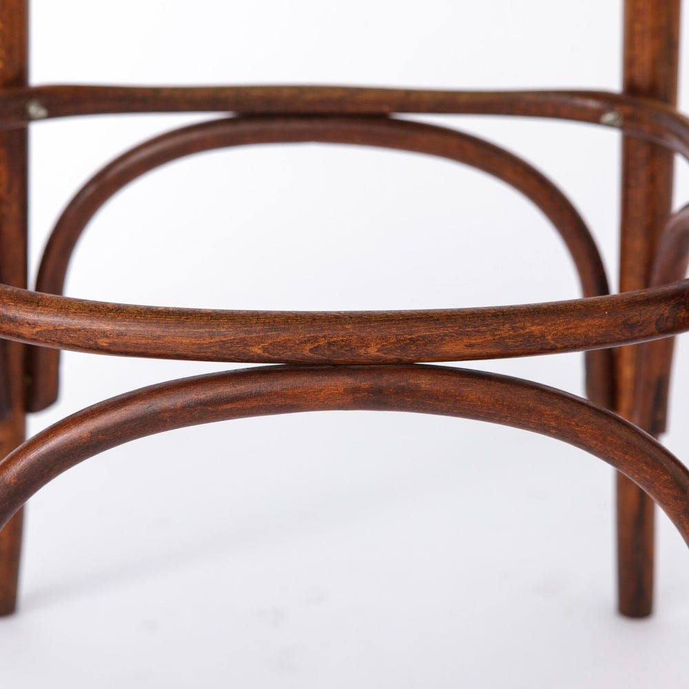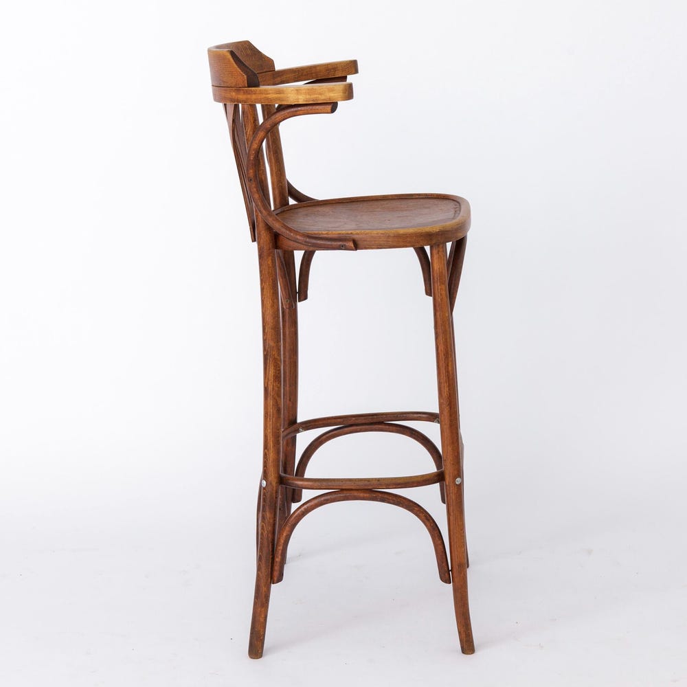 This vintage bar stool from the 1960s-1970s is a unique piece with a sturdy dyed beech bentwood frame that has been refurbished and oiled to enhance its natural beauty. Although it is not marked, it remains a very interesting and functional vintage item. Please note, one of the bars under the seat is missing (as seen in the second photo), but this does not affect its overall stability or use.