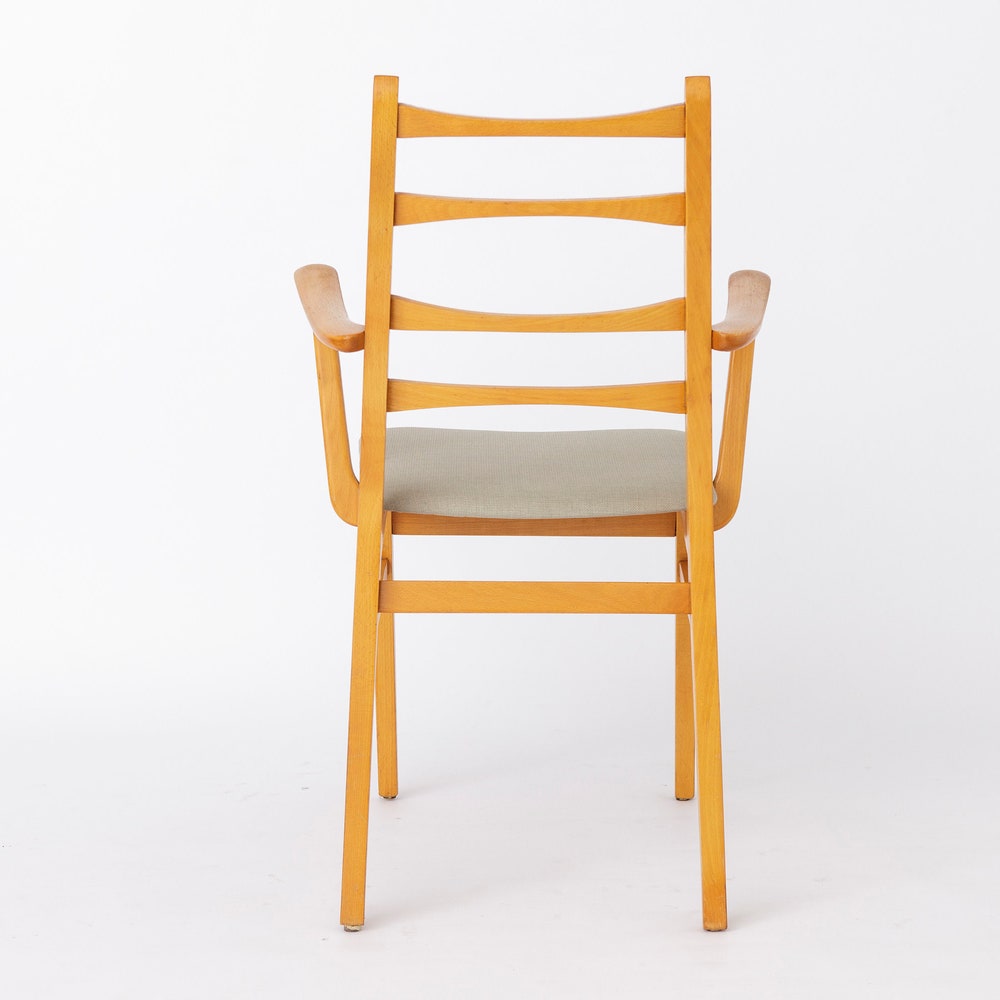 This charming vintage armchair from the 1960s is a perfect addition to any mid-century modern space. With a sturdy beech wood frame and beautiful light green upholstery, this piece combines timeless design with durability. There is just one available, making it a rare find!
