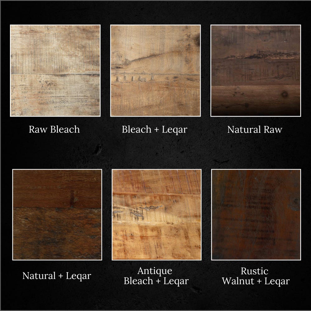 | Finishes | Raw Bleach, Bleach + Leqar, Antique Bleach+Leqar, Natural Raw, Natural + Leqar, Rustic Walnut+ Leqar, Rustic Black, Rustic White, Rustic Grey, Rustic Mint |
