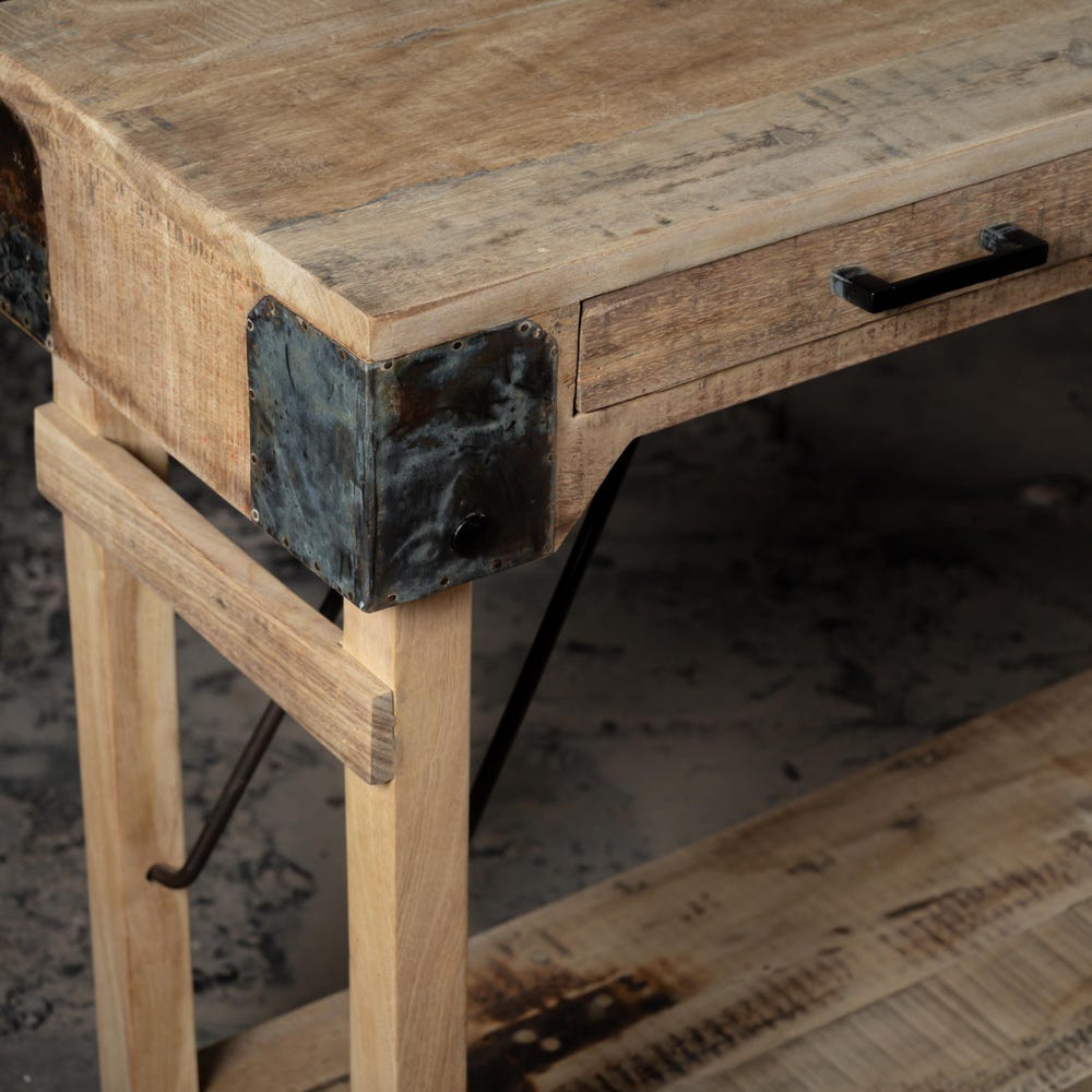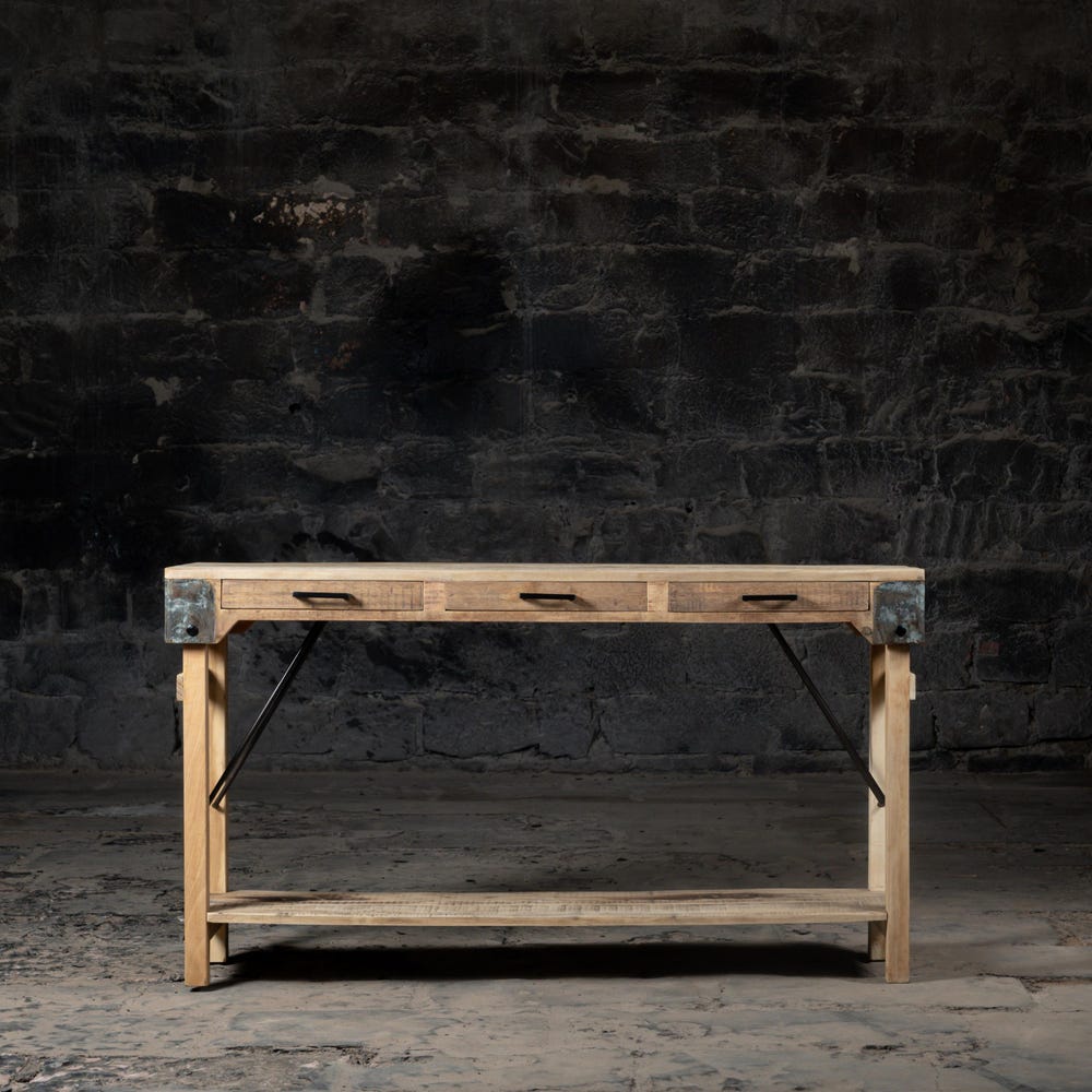 This stylish vintage reclaimed wood console desk features 3 spacious drawers, offering both storage and rustic charm. Crafted from eco-friendly materials, its unique wood grain and sturdy design make it the perfect addition to any living room, hallway, or entryway.