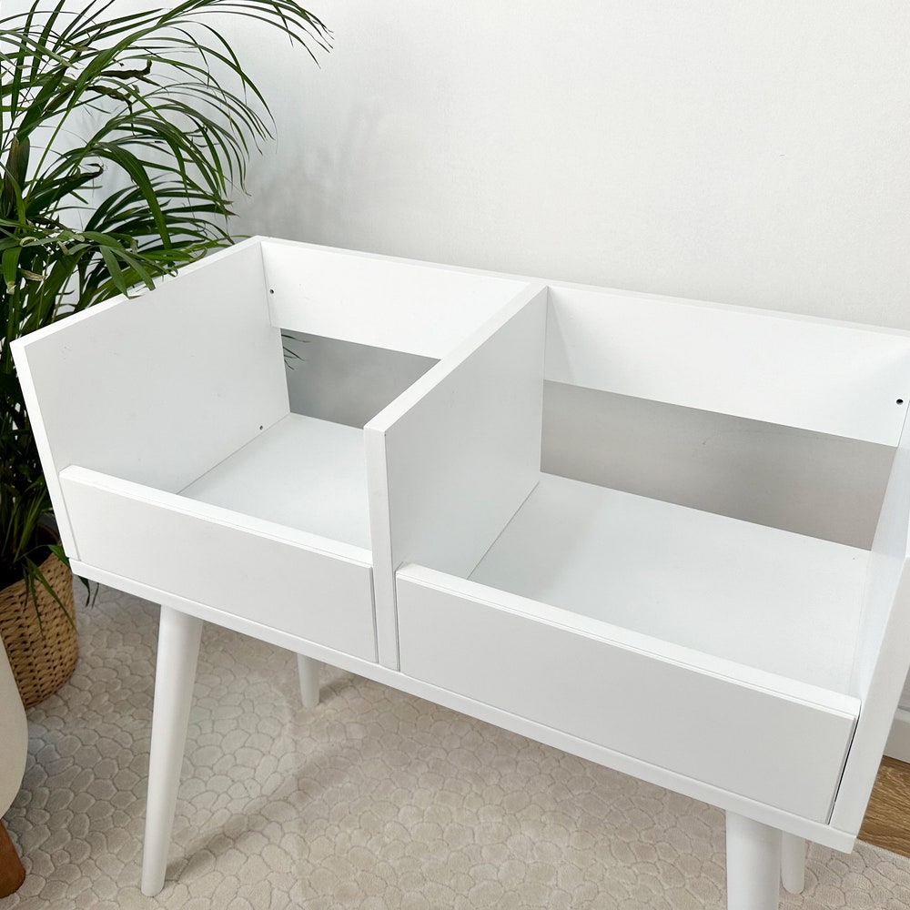 Our vinyl record storage space is not just for music enthusiasts; it’s designed to be versatile. Whether used as a cabinet, vinyl storage unit, turntable stand, or plaque stand, it serves as a media console table. It even works well as a sideboard or a beverage and display cabinet. With felt pads under the legs, it won’t scratch your floor.