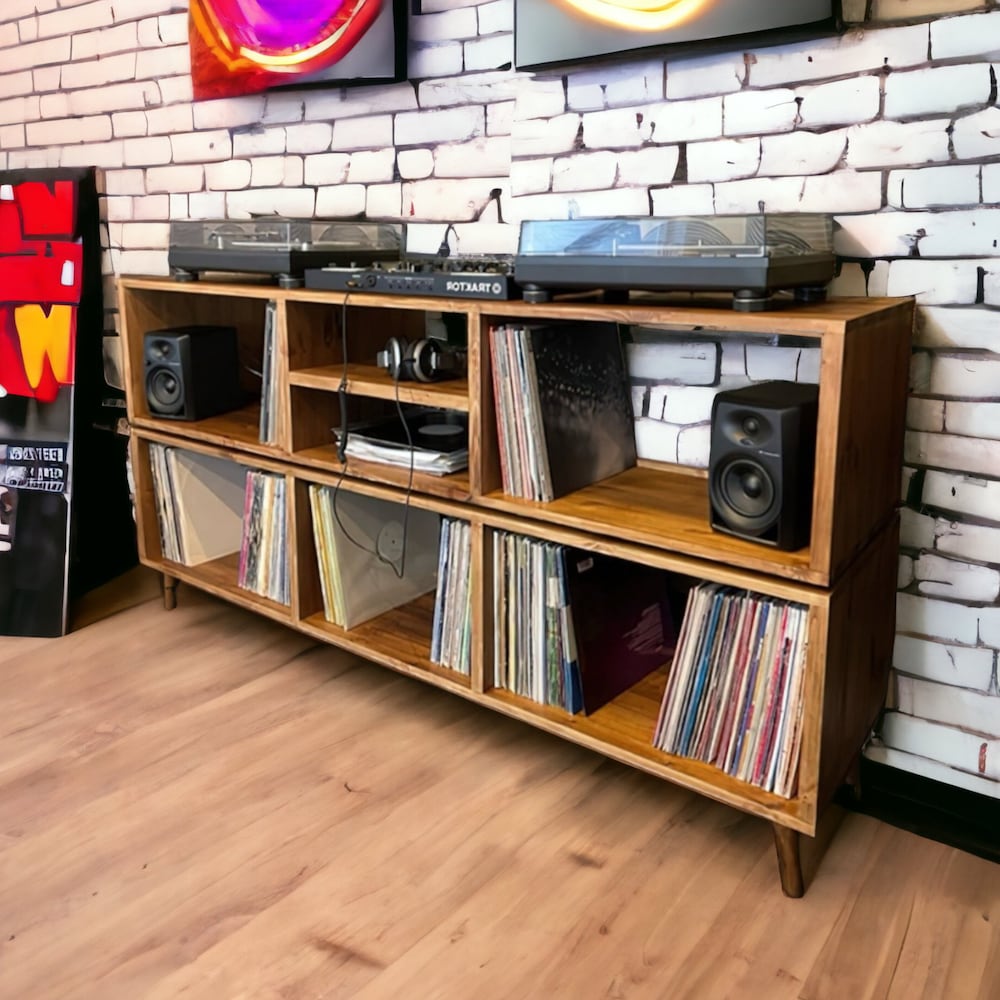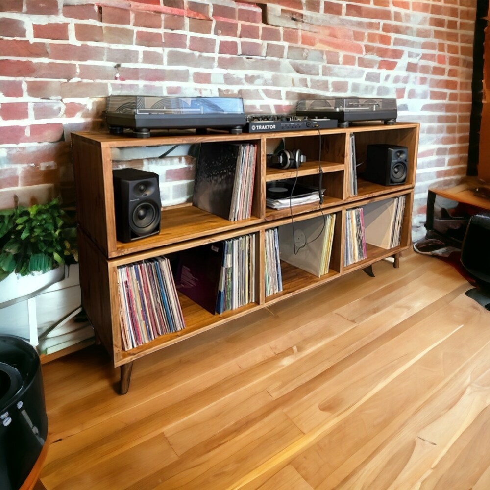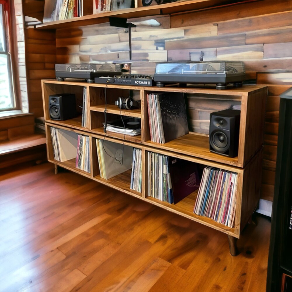 Vinyl display open shelf modern turntable dj music cabinet modular Tv stand scandinavian bookshelf reclaimed wood amp storage rustic vintage