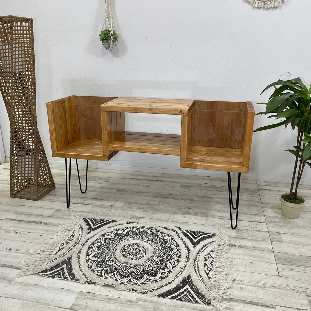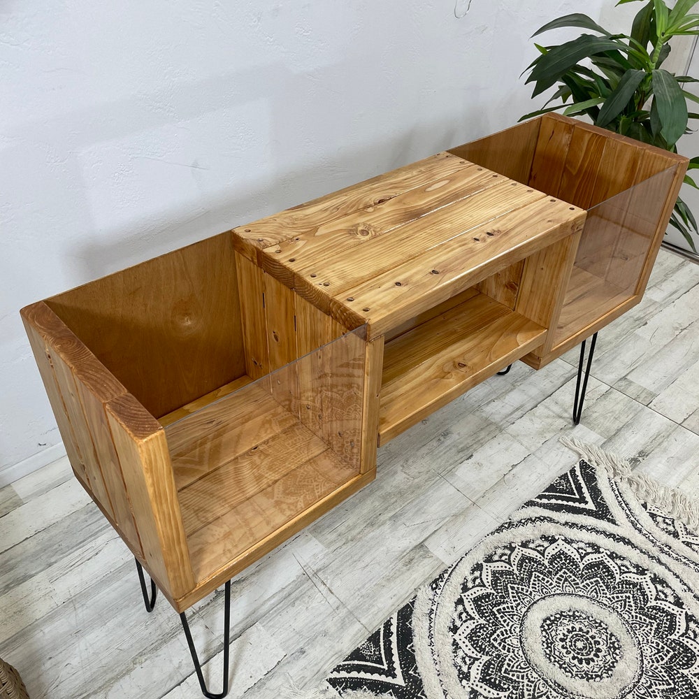 Handmade modern furniture arrives fully assembled. The front has a transparent acrylic sheet to see your vinyl albums and flip through your records.