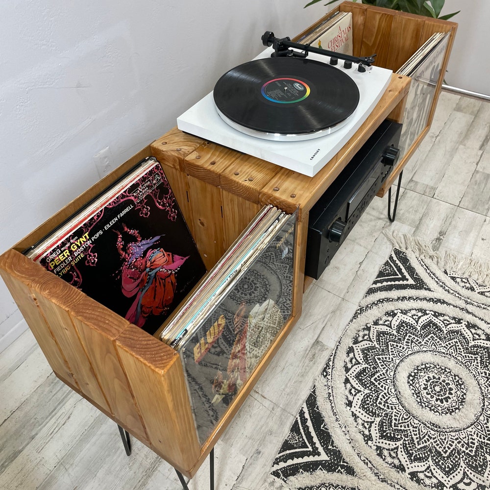Modern Record Player Stand ∙ Turntable Stand ∙ Record Crate Front flip with Turntable and Receiver Handmade modern furniture arrives fully assembled. The front has a transparent acrylic sheet to see your vinyl albums and flip through your records. Vinyl Record Capacity: 150 Albums-Holds 75 Records per side DIMENSIONS: -Length (left to right) 50.5″-Depth (front […]