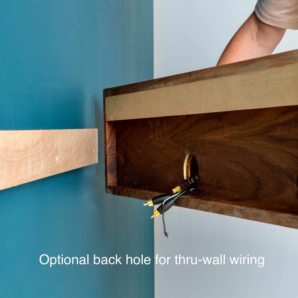 The solid back is Walnut veneer ply for seasonal stability. The back conceals an integrated mounting cleat. All necessary hardware and detailed install guide included. Properly mounted to wall studs, this table can easily hold 150-200 lbs.
