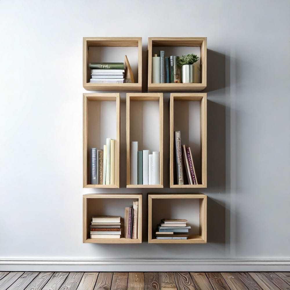 Introduce a blend of modern design and functionality into your living space with this stunning set of 7 wall-mounted bookshelf units by WoodmadeCreation. Designed for both style and practicality, this shelving system offers a perfect solution for organizing and showcasing books, decorative pieces, and personal collections.