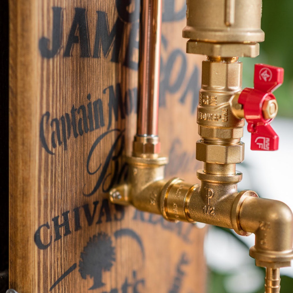 The product is made of plumbing things, which create an interesting vintage industrial look. The dispenser system is built onto a board of wood which is hand stained and varnished.