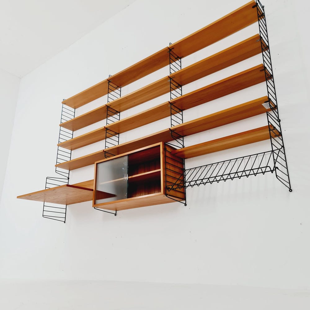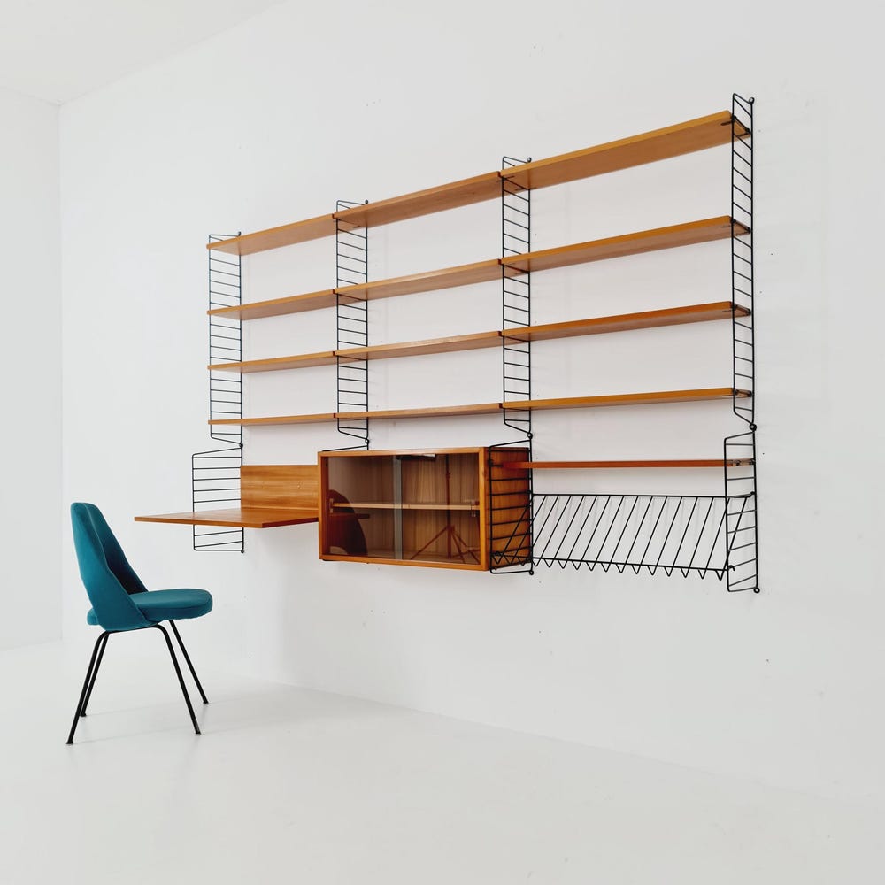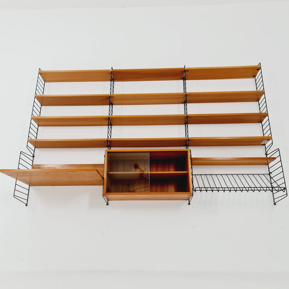 Wall-mounted original Swedish string shelf system, drawers, bookcase Ash wood by Nils & Kajsa Strinning, 1960s