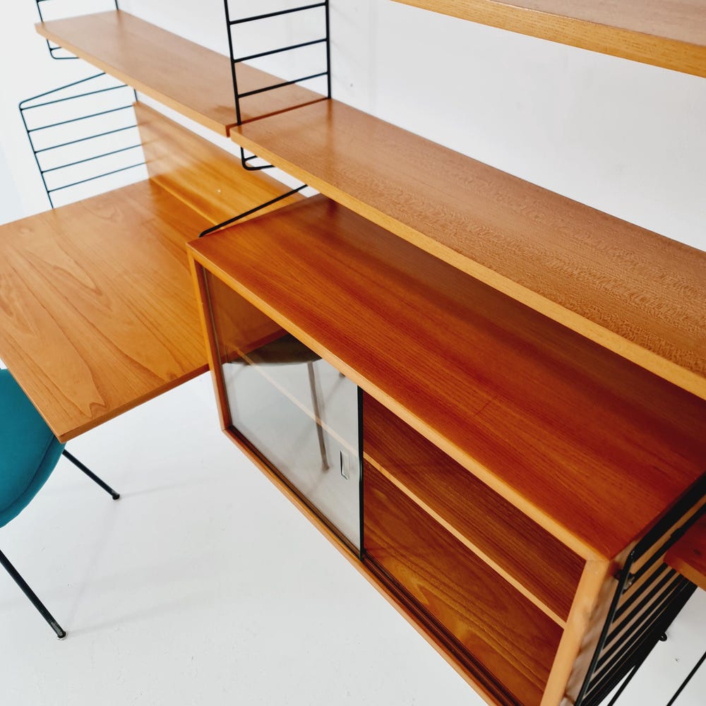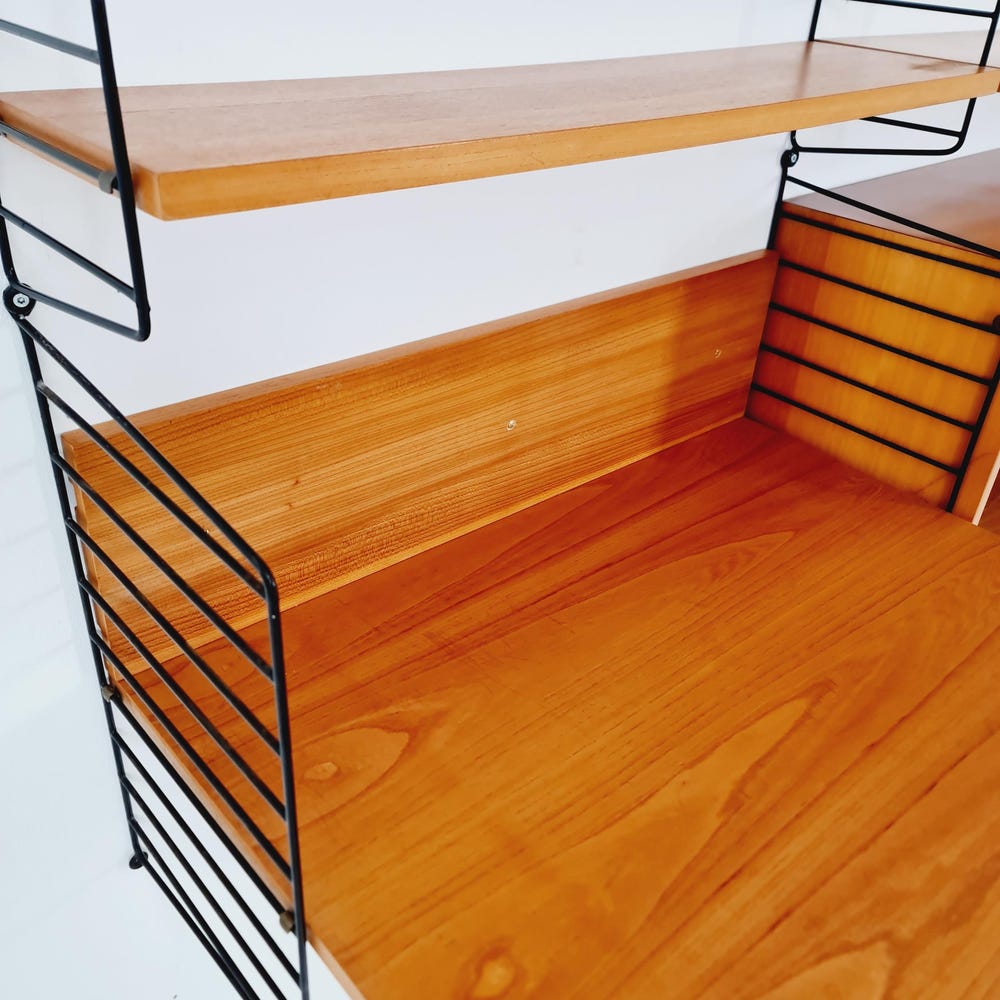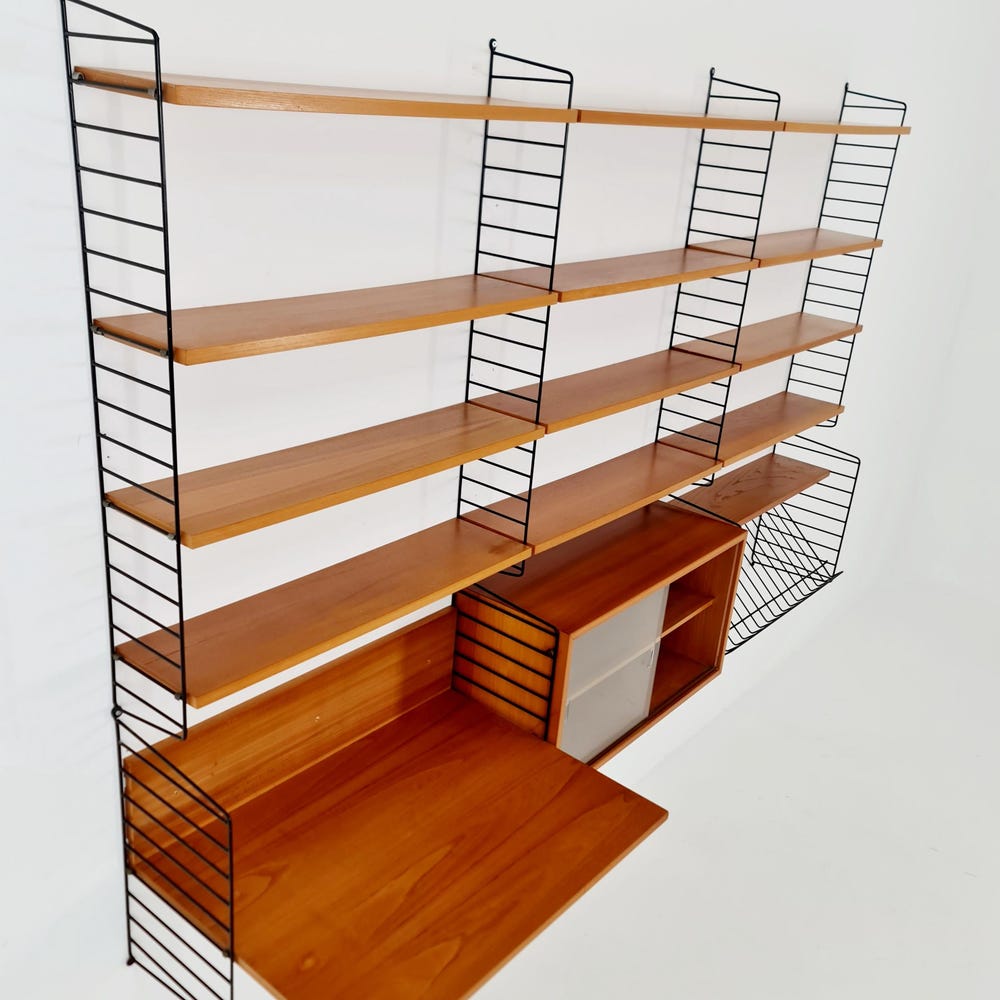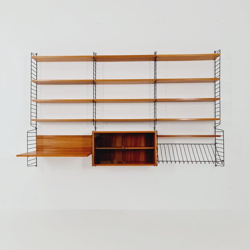 Wall-mounted original Swedish string shelf system, drawers, bookcase Ash wood by Nils & Kajsa Strinning, 1960s