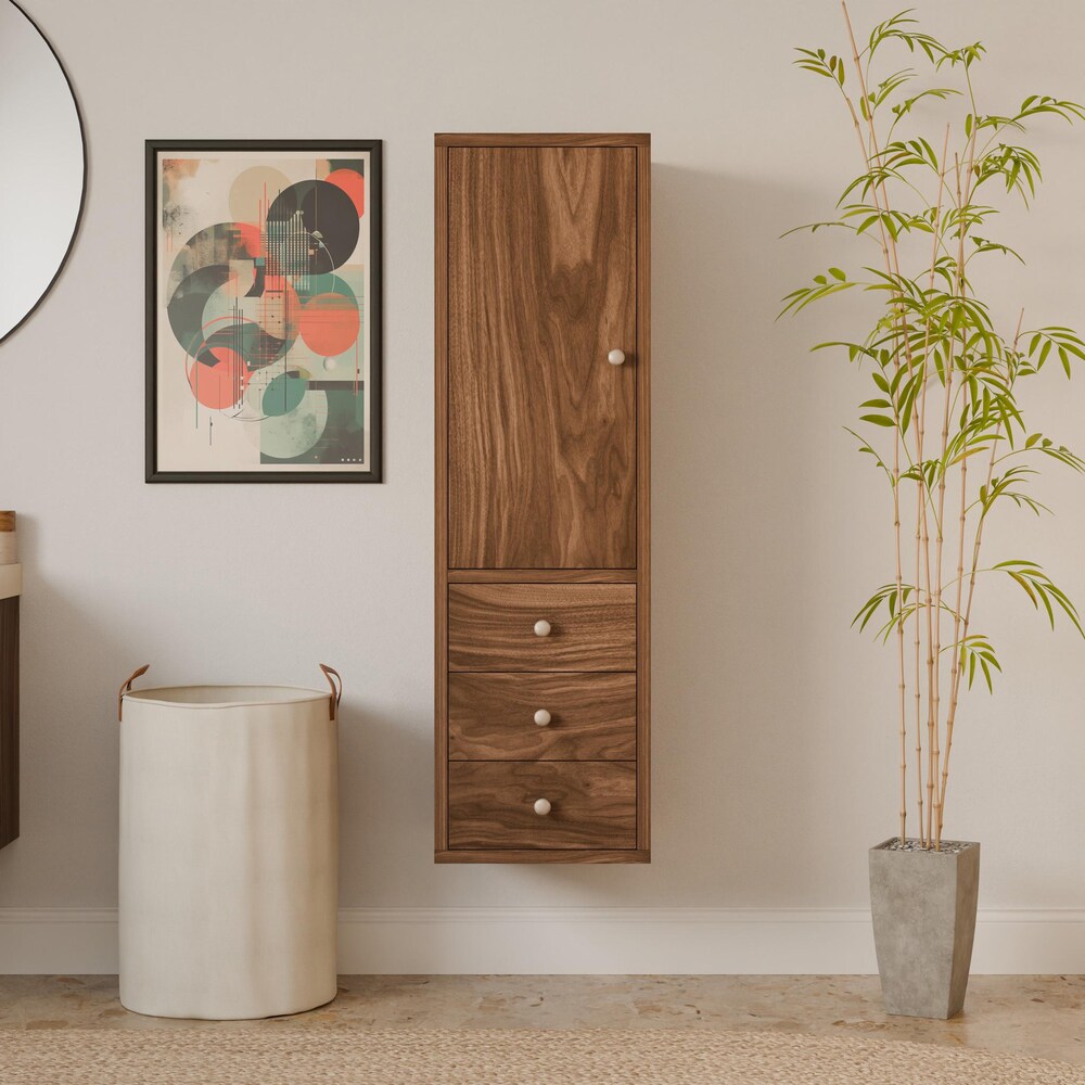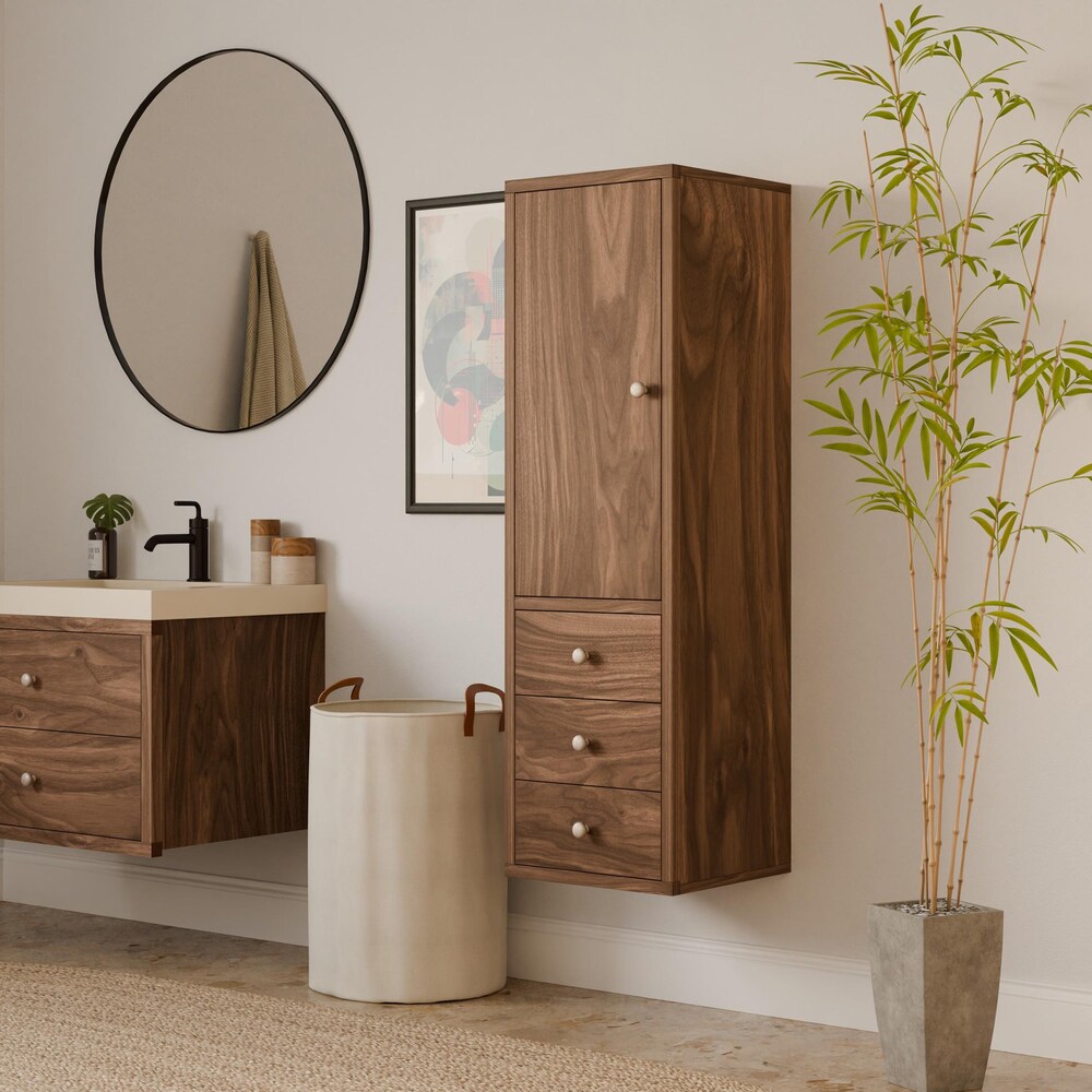 Arrives fully assembled at your door. Built from premium grade 3/4″ real Walnut veneer with a durable 1/2″ back, this bathroom storage cabinet is built for strength and longevity.