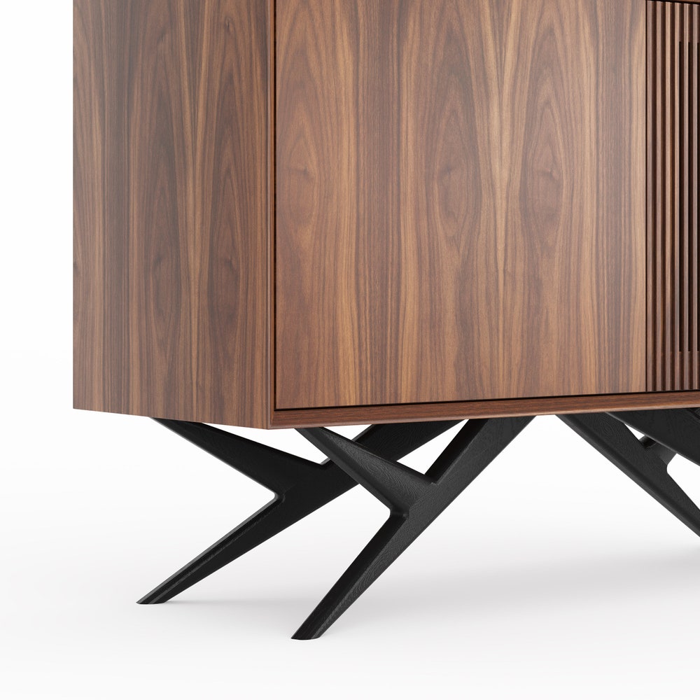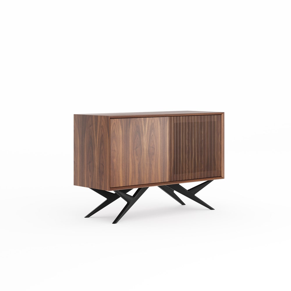 Walnut cabinet with two slatted doors and organic shape base in mid century modern style, credenza, walnut vinyl stand, commode, TV stand