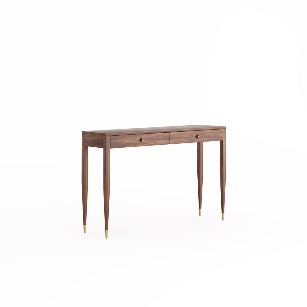 Walnut console table in mid century style with two drawers, four tapered legs, brass handle and brass feets.