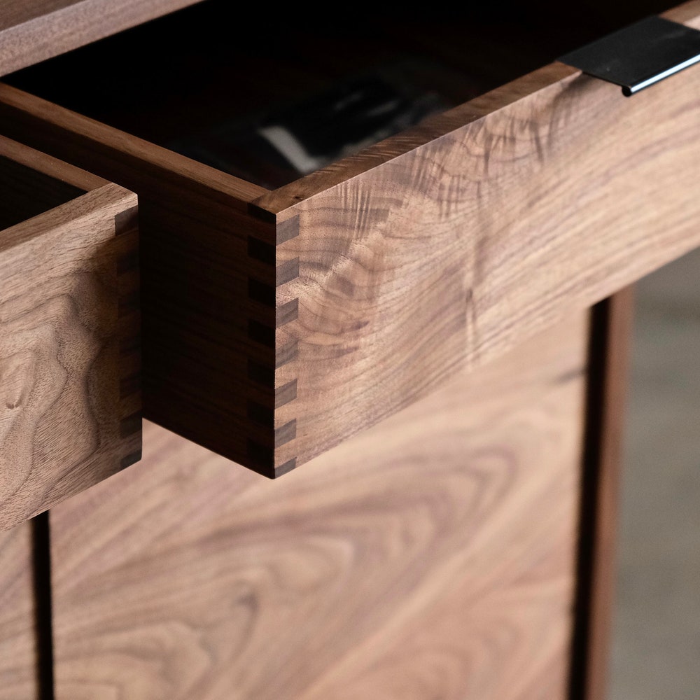 All solid walnut, including drawers, sliding doors and shelves behind sliding doors.