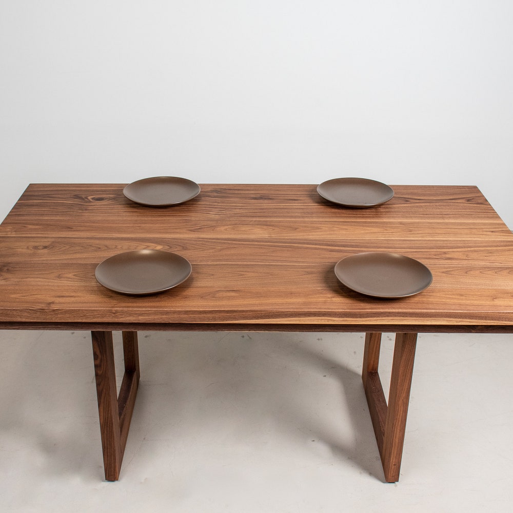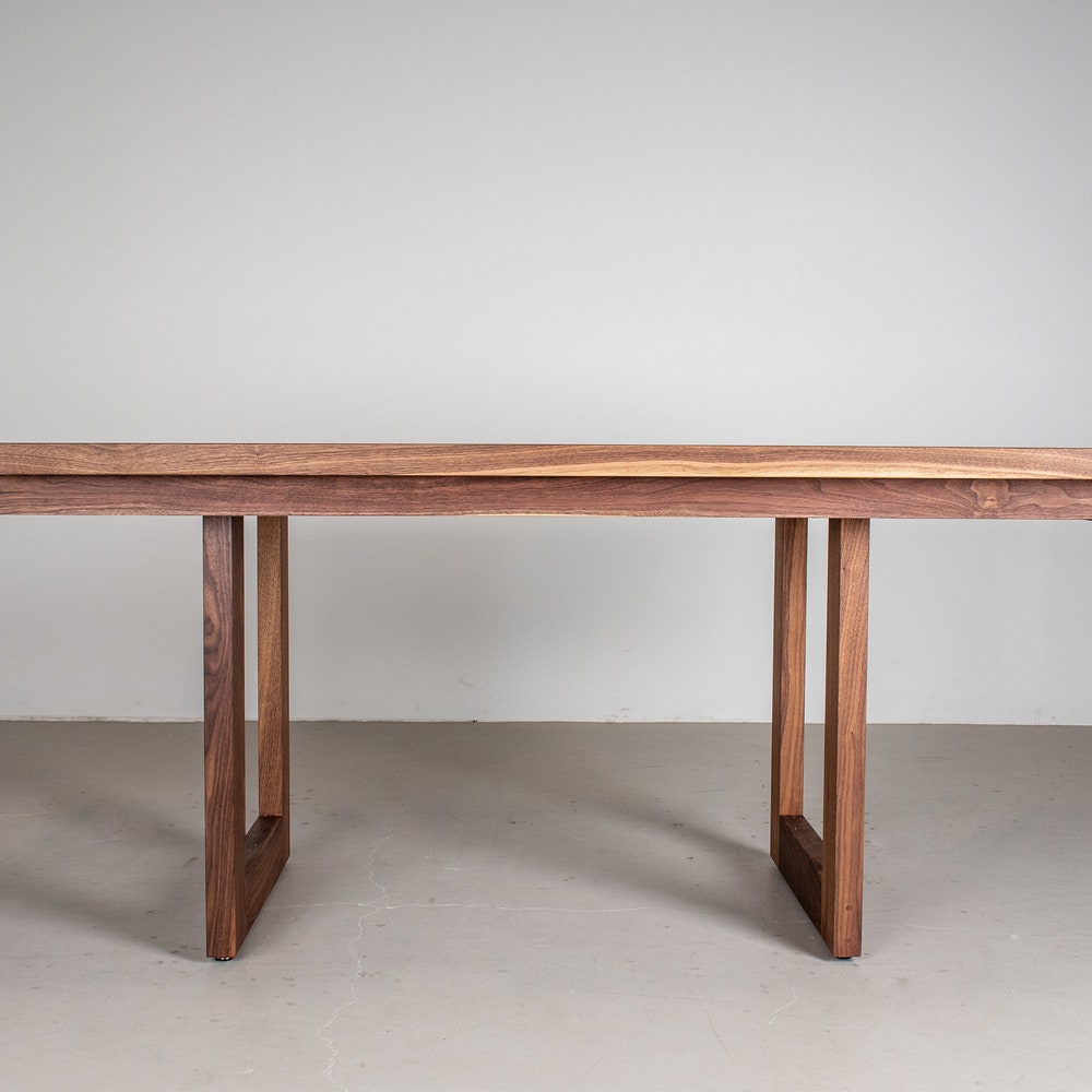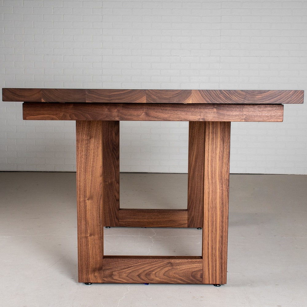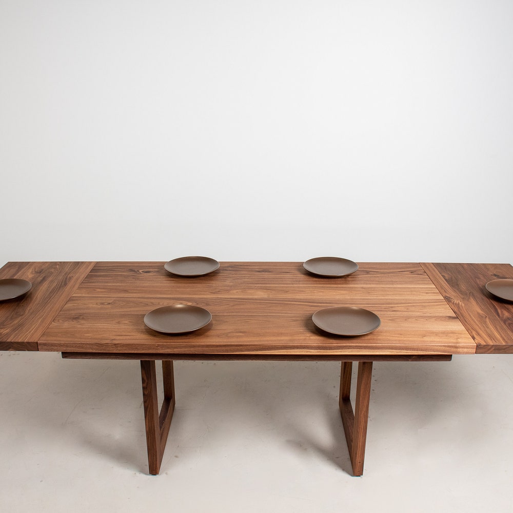 Bring a mid century modern aesthetic to your dining room with this extendable dining table made of walnut wood. The rich tones of the walnut wood combine with the square Seymour edges and the square walnut Sakami legs to create a strong mid century modern look. This table is perfect for a dining room as it is extendable with 2 leaves that add in one to each end of the table. We build every table to order so there are many ways to make this table perfect for you.
