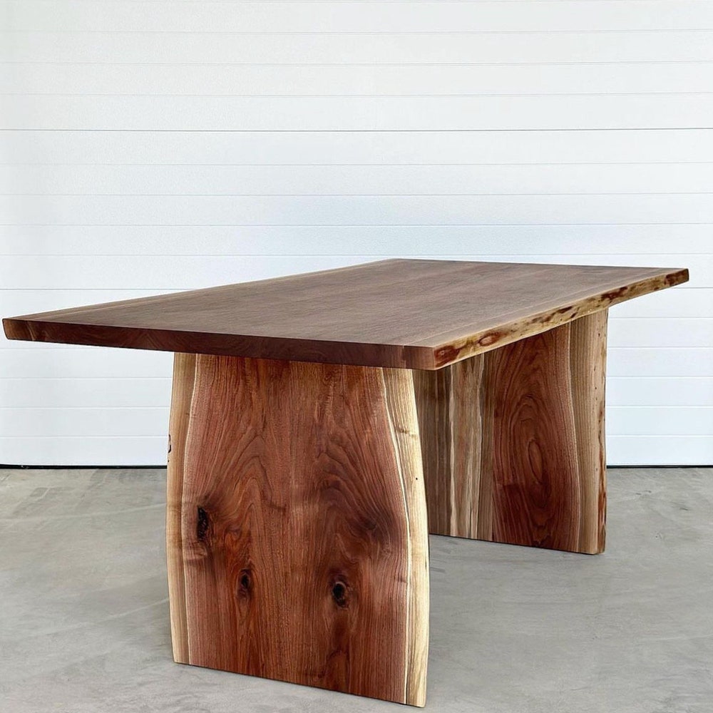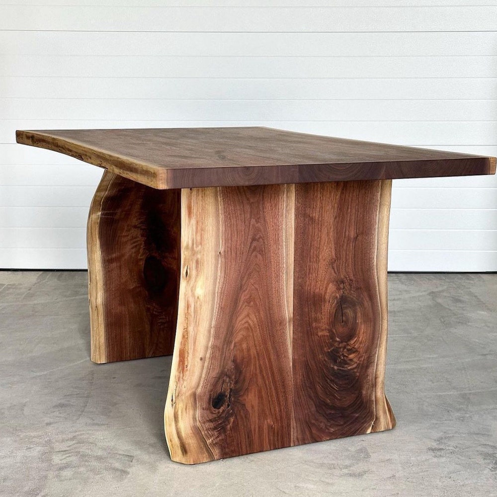 This modern, organic walnut live edge table features continuous grain slab legs. It’s a timeless piece of furniture that will serve as a cherished addition to your home for generations.