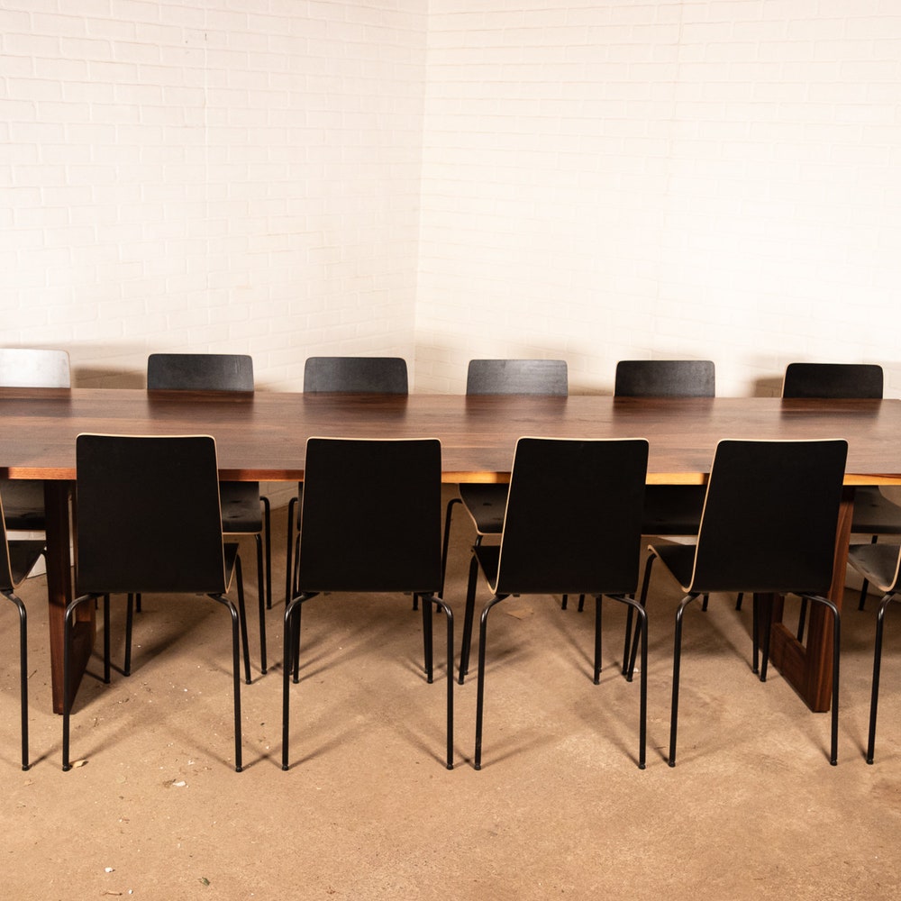 Add elegance to your dining room with this mid century modern dining table. The clean lines of this walnut table on minimalist legs makes it a great centerpiece of a modern dining room. We build every table to order so there are many ways to make this table perfect for you.