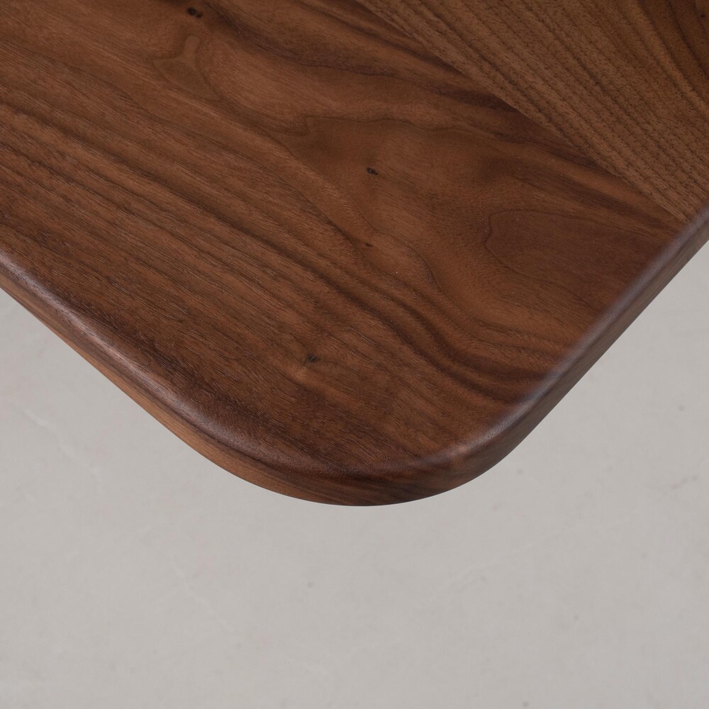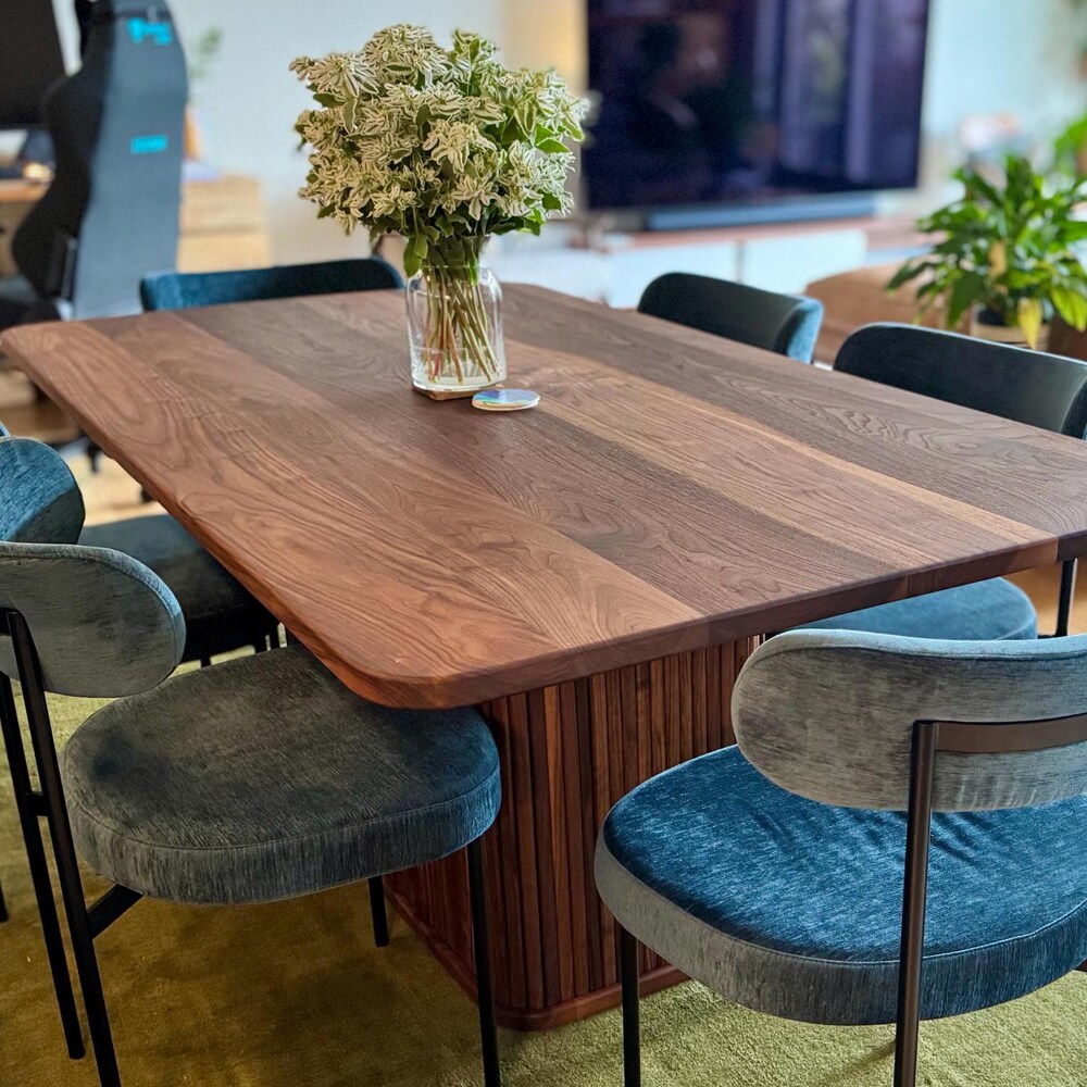 This walnut dining table on a pedestal base was built for a customer and is now in their home. We can build one like it for you that is tailored to your needs. We build every table out of solid hardwoods one at a time. Our design team is happy to help you figure out the details of the table that is best for you.