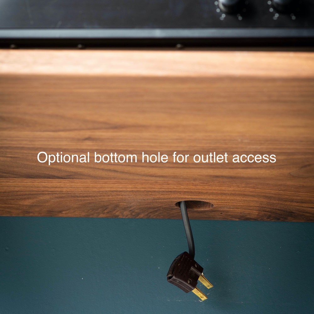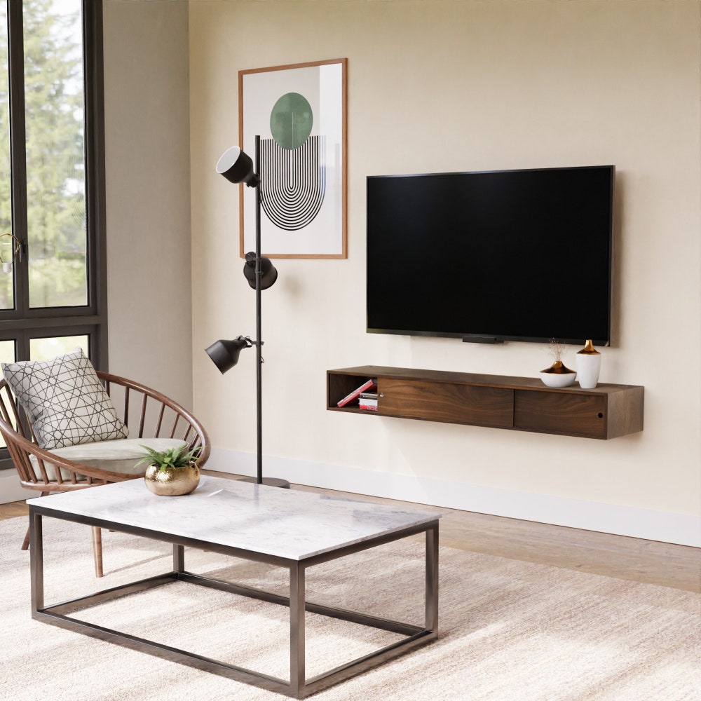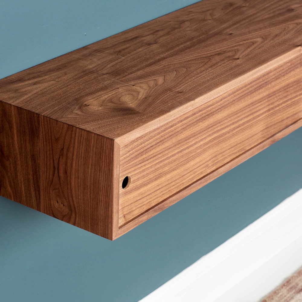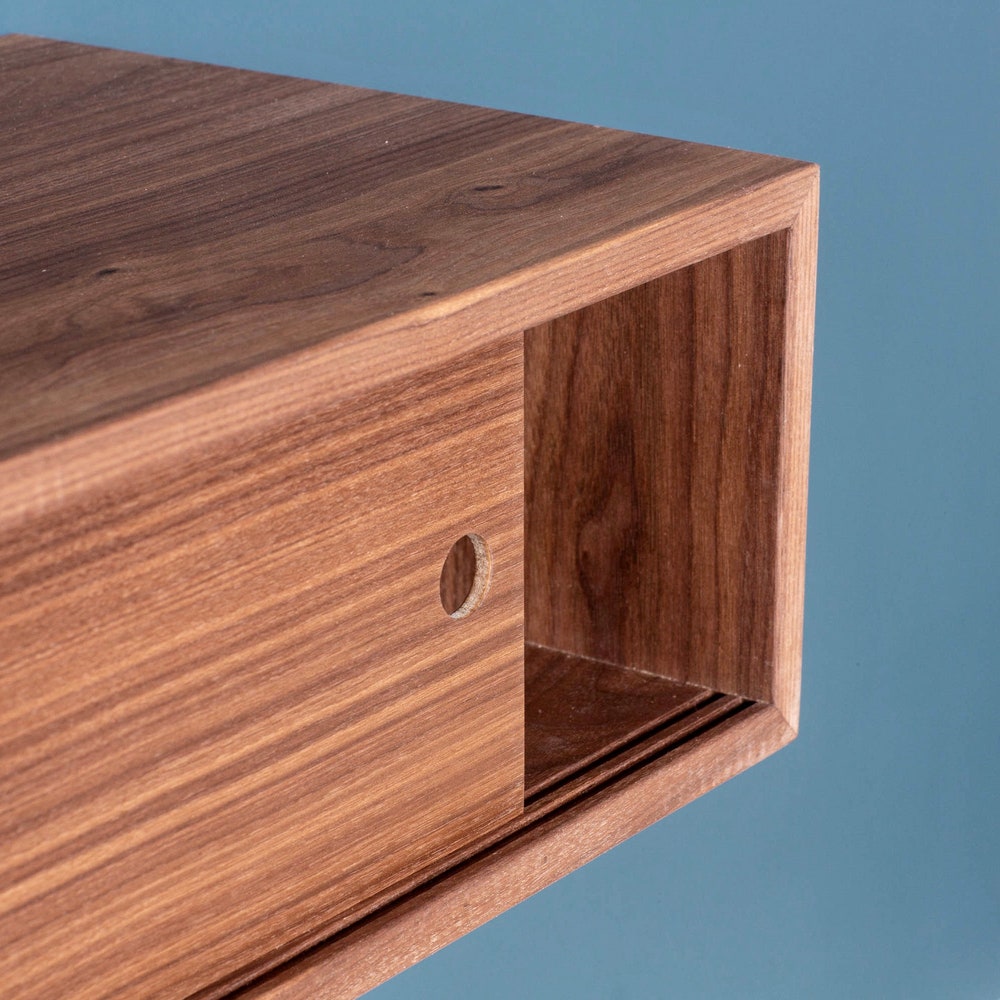 Our Walnut Floating Media TV Stand is the perfect piece for your media / TV room. Built from solid American Black Walnut with beautiful wrap-around grain across the top and sides. Neatly hide your electronics and dress up the room at the same time.