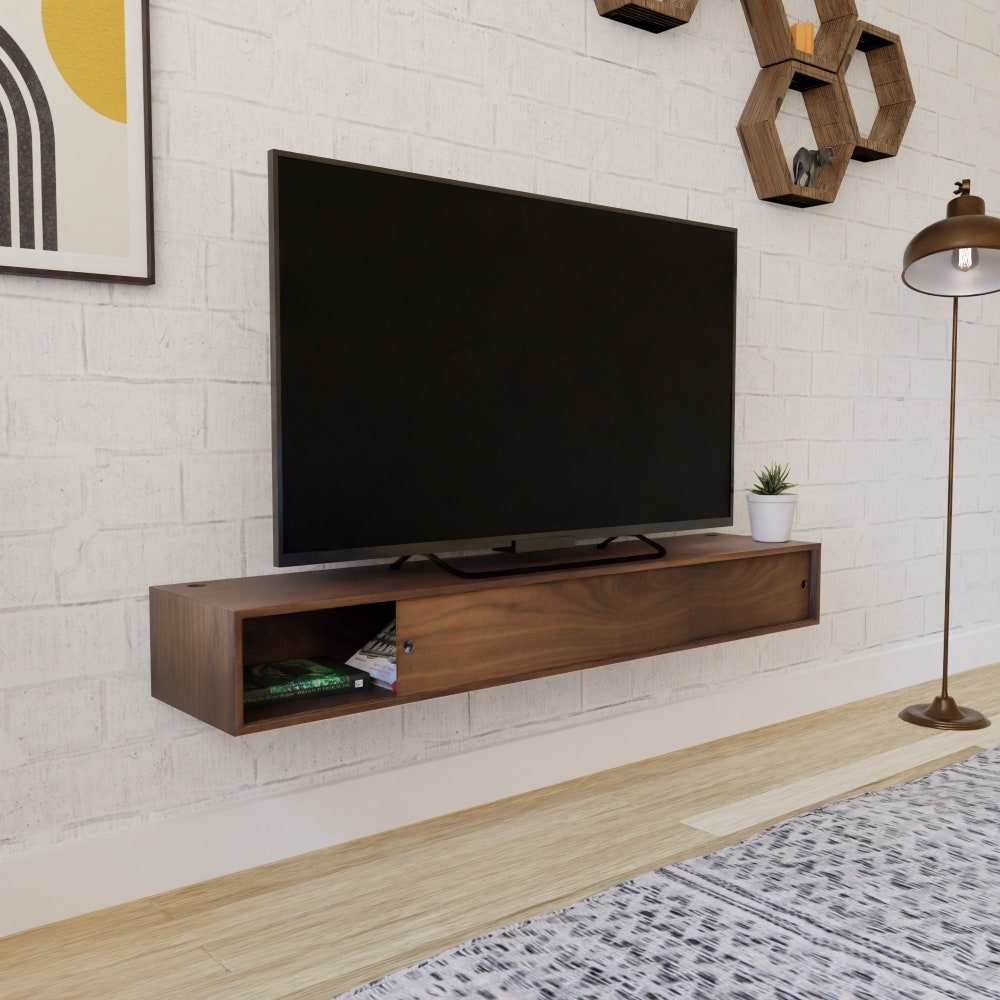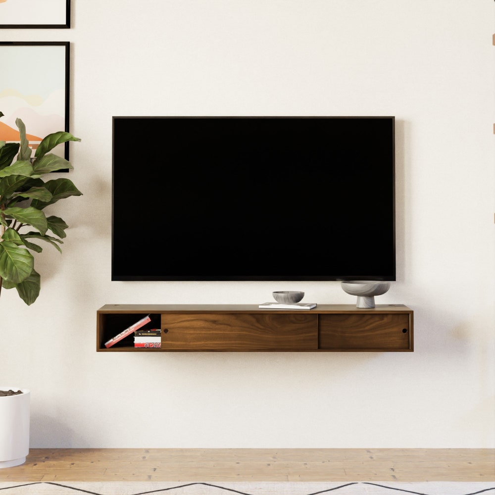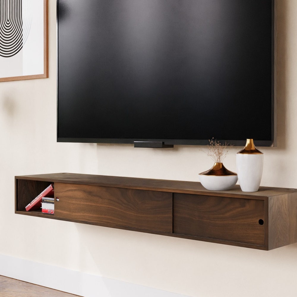 Walnut Floating TV Stand Media Console with Sliding Doors, TV Stand