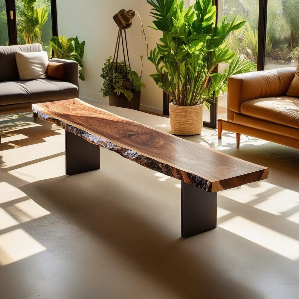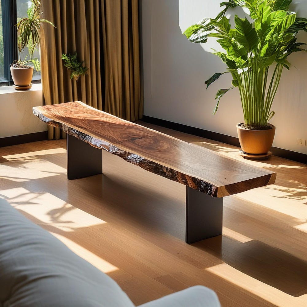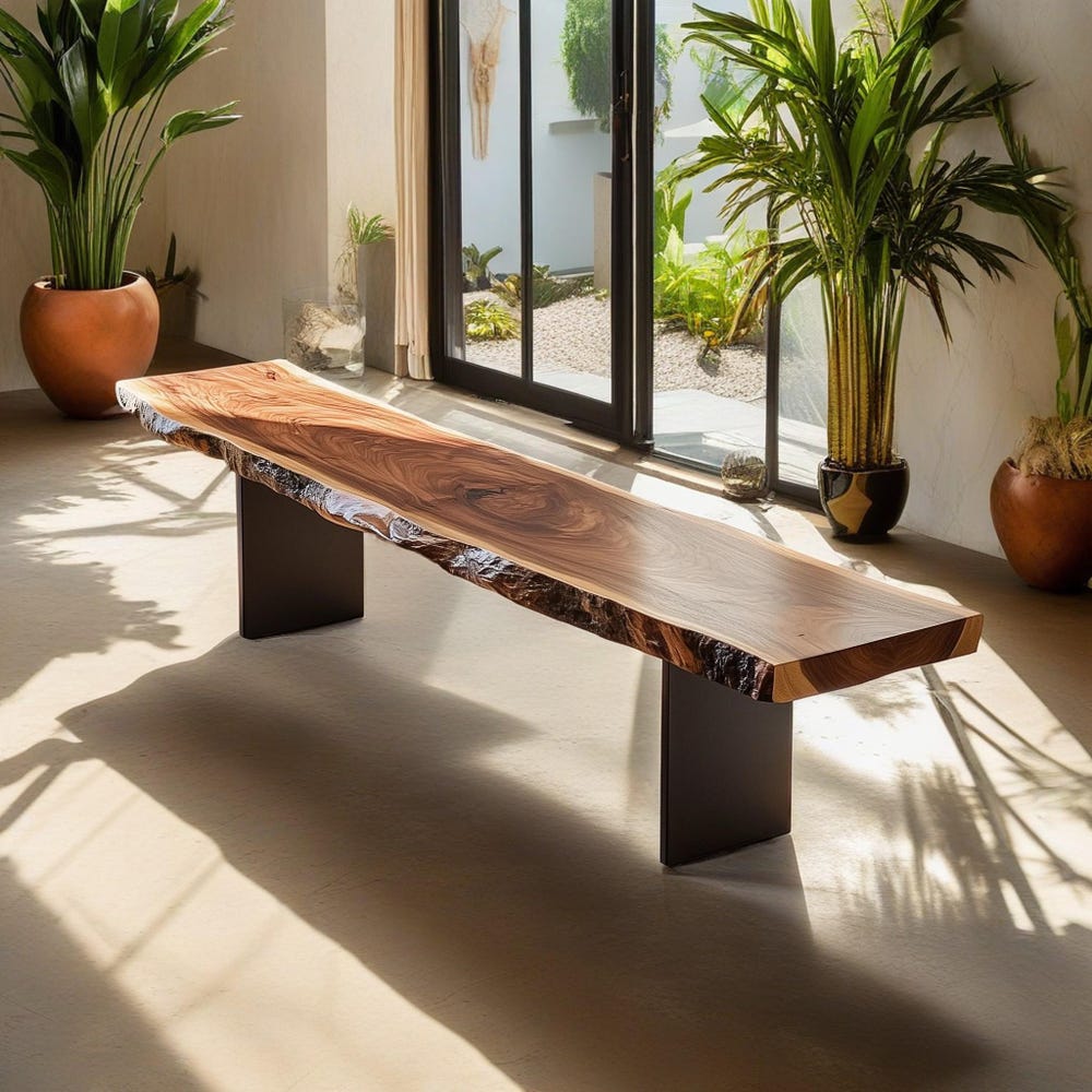 This Live Edge Walnut Bench beautifully blends rustic charm and modern design. Handcrafted from solid walnut, the natural live edge showcases the wood’s organic shape, while sleek metal legs provide a minimalist contrast. Ideal for living rooms, entryways, or as additional seating, this bench adds timeless style and functionality to any space.