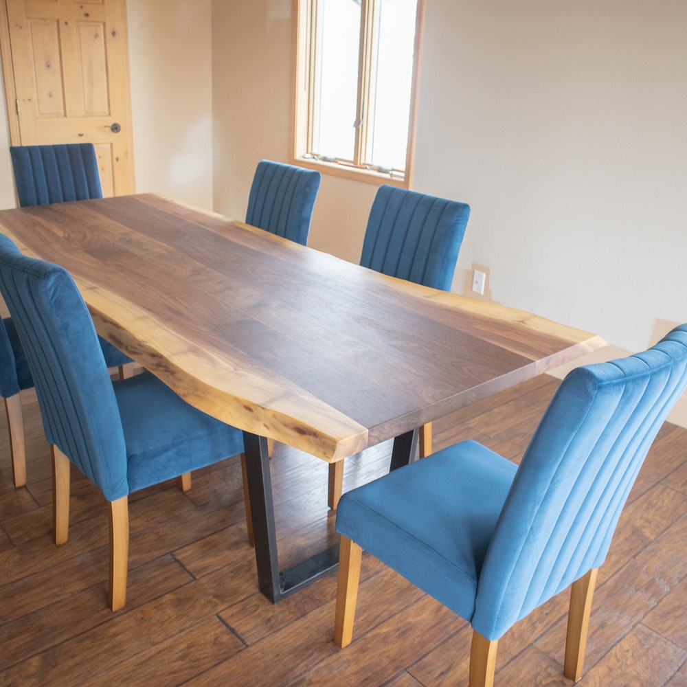A walnut live edge table is a great piece to anchor your dining space. As a one of a kind piece it is always a conversation starter and the coloring in the walnut is beautiful. A true live edge on a hardwood table like this one follows the original contours of the tree, reminding you that your table of its origins. We build every table to order so there are many ways to make this table perfect for you.