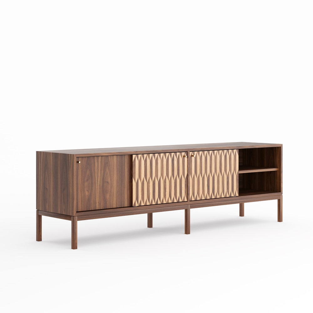 Beautiful walnut long sideboard TV stand with three inlaid sliding doors in mid-century modern style.