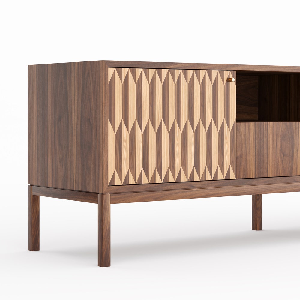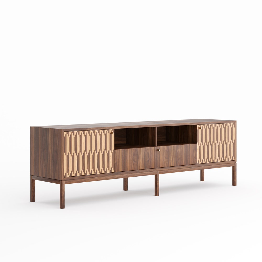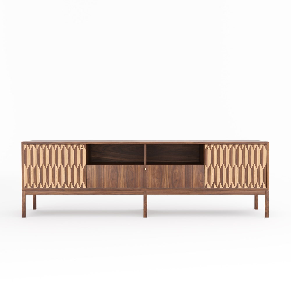 Walnut long sideboard, TV stand with two inlaid doors and one drawer in mid century modern style, credenza, dresser, commode, media cabinet