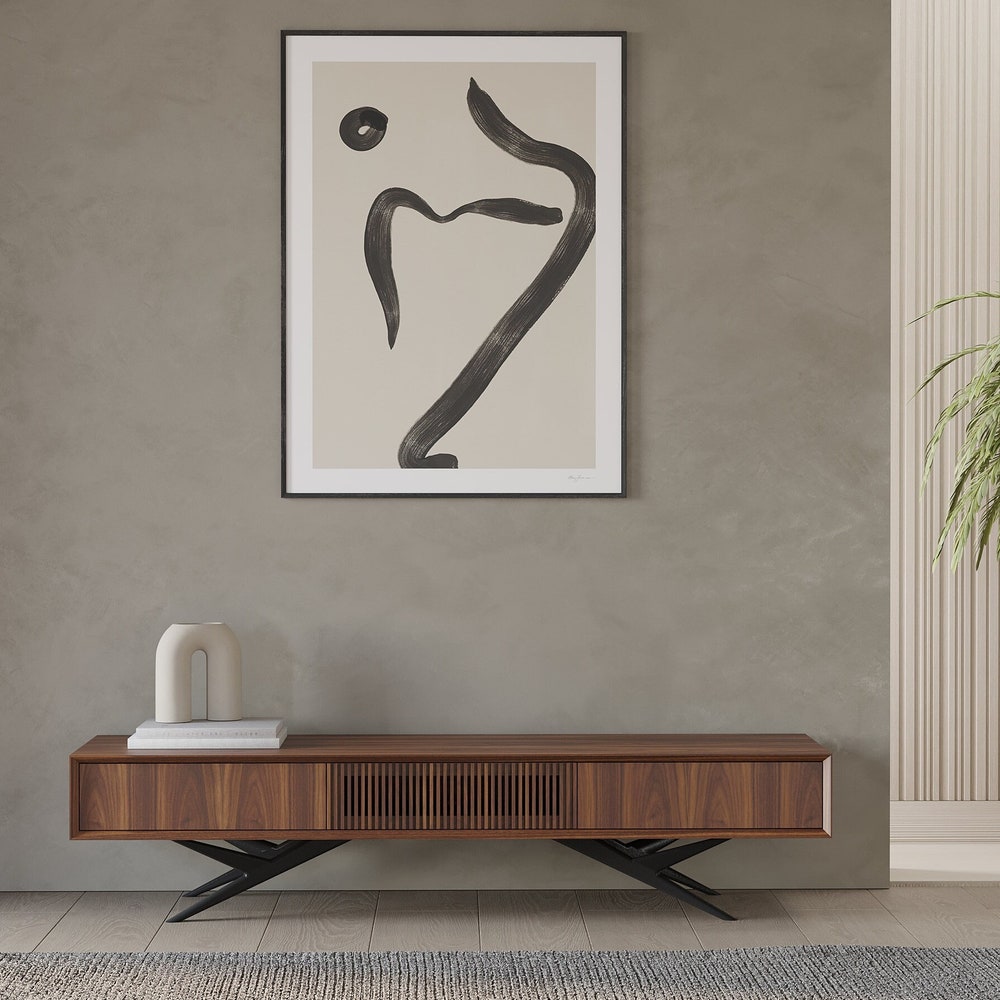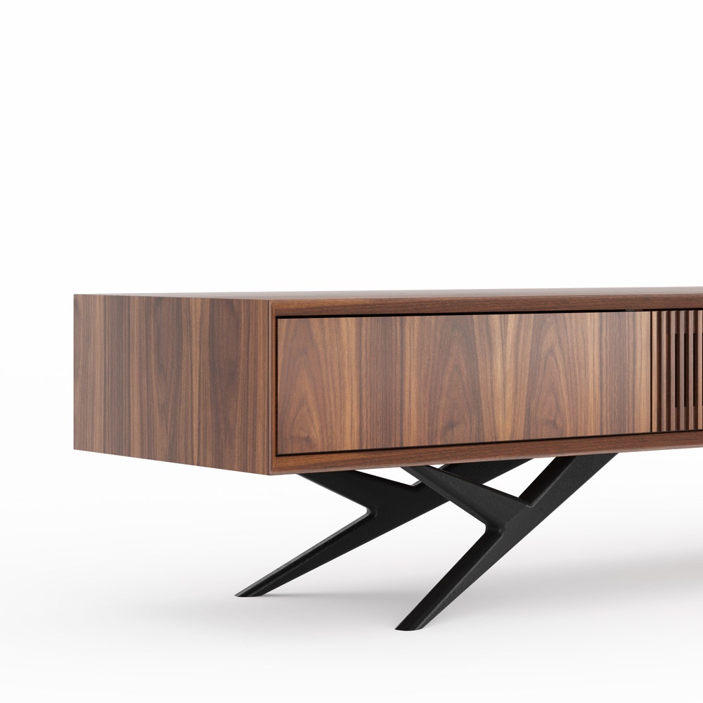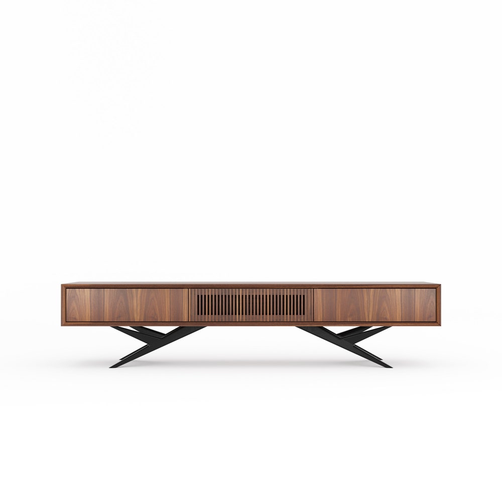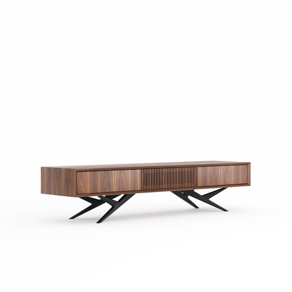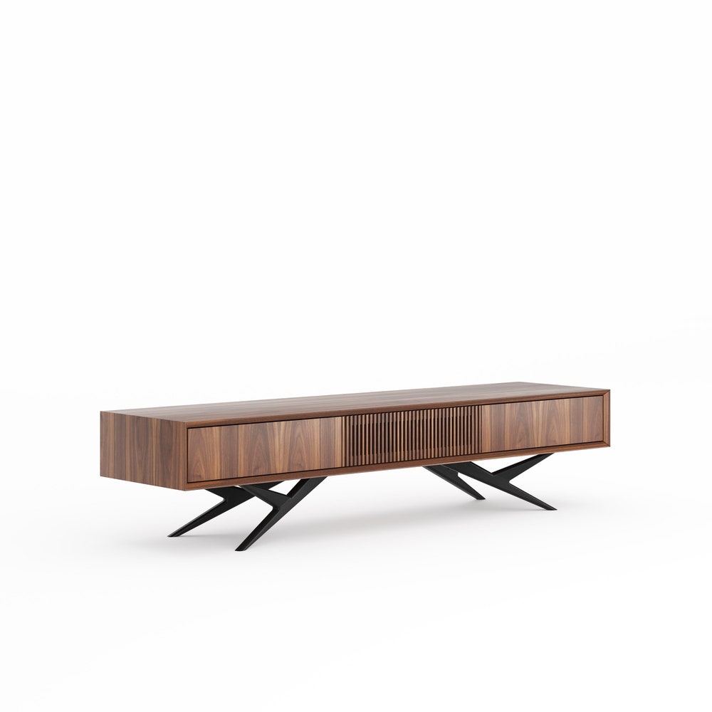 Beautiful walnut long tv stand with slatted door, two drawers and organic shape base in mid century modern style.