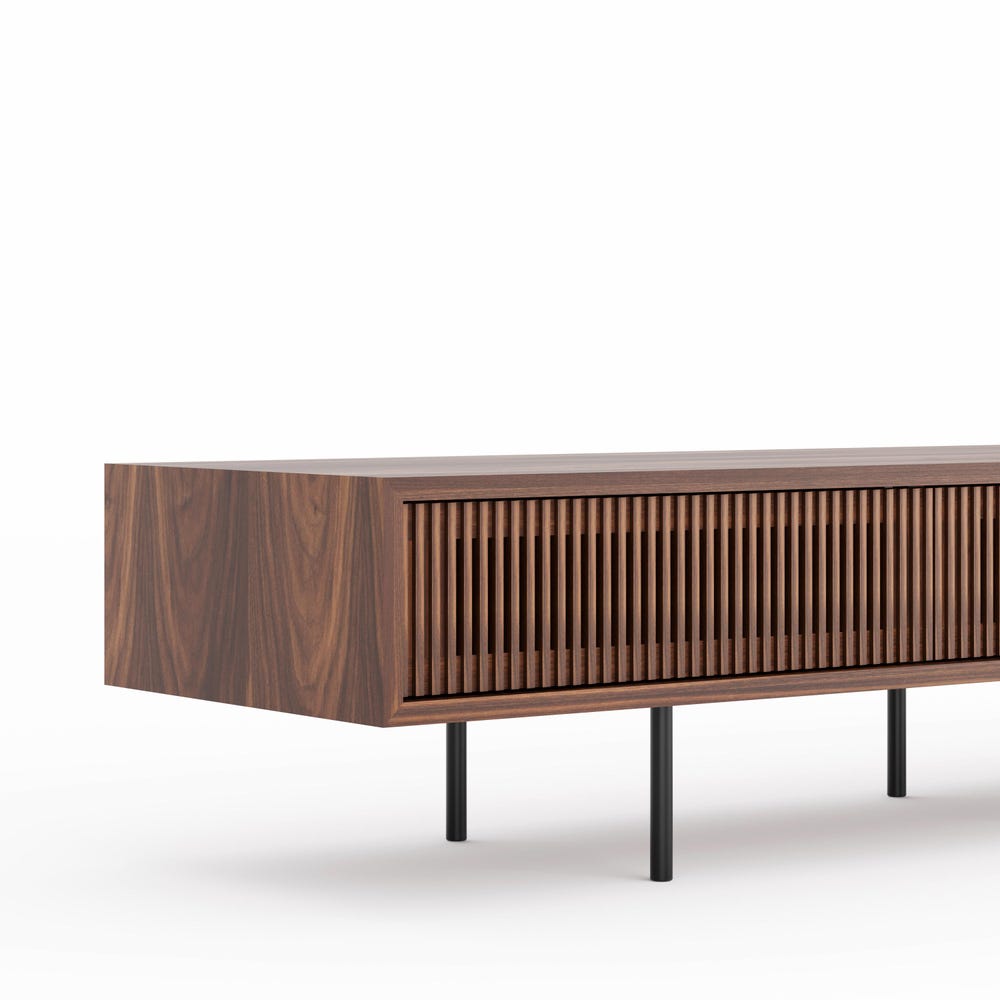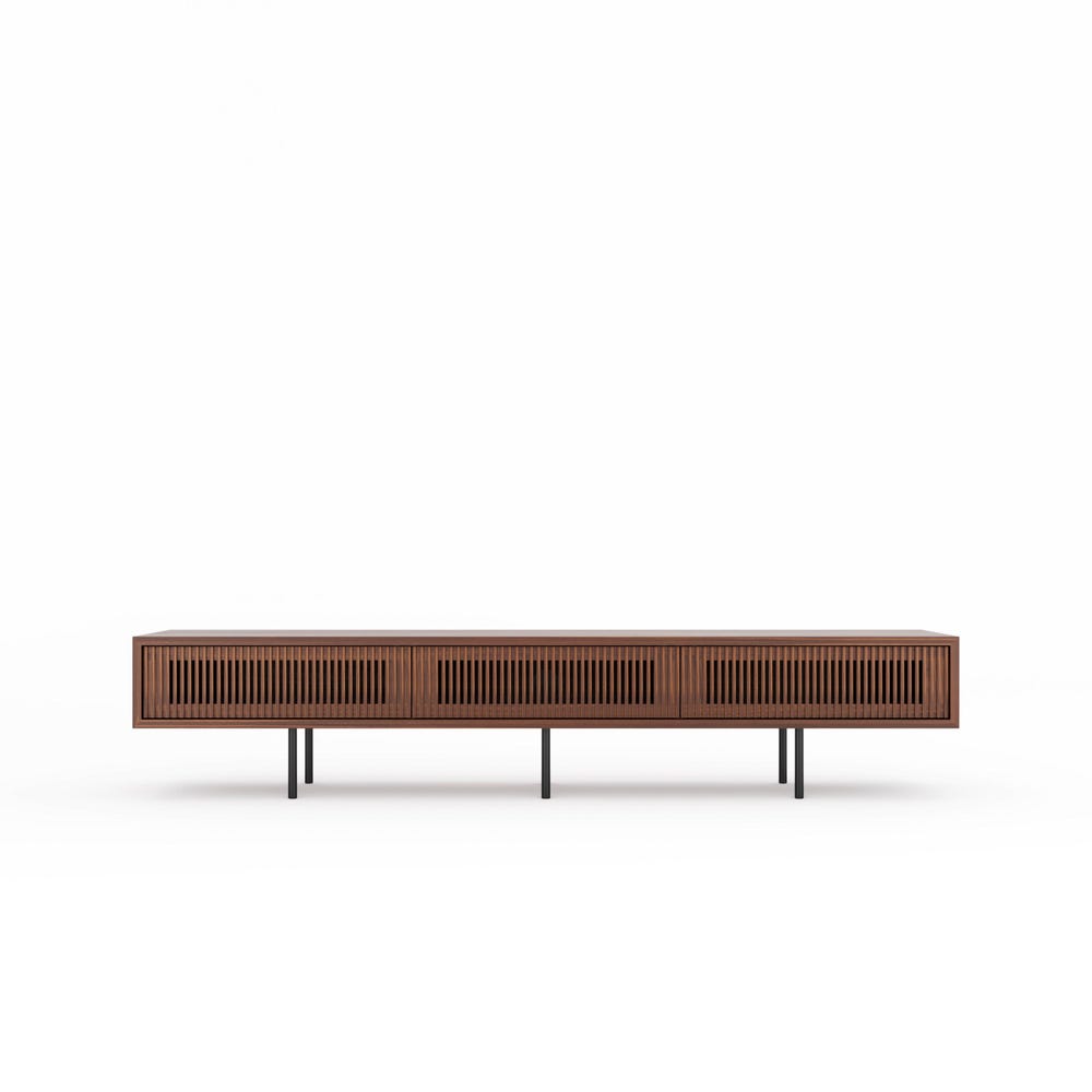 Walnut lowboard with three slatted doors and simple aluminum black legs in mid century modern style.