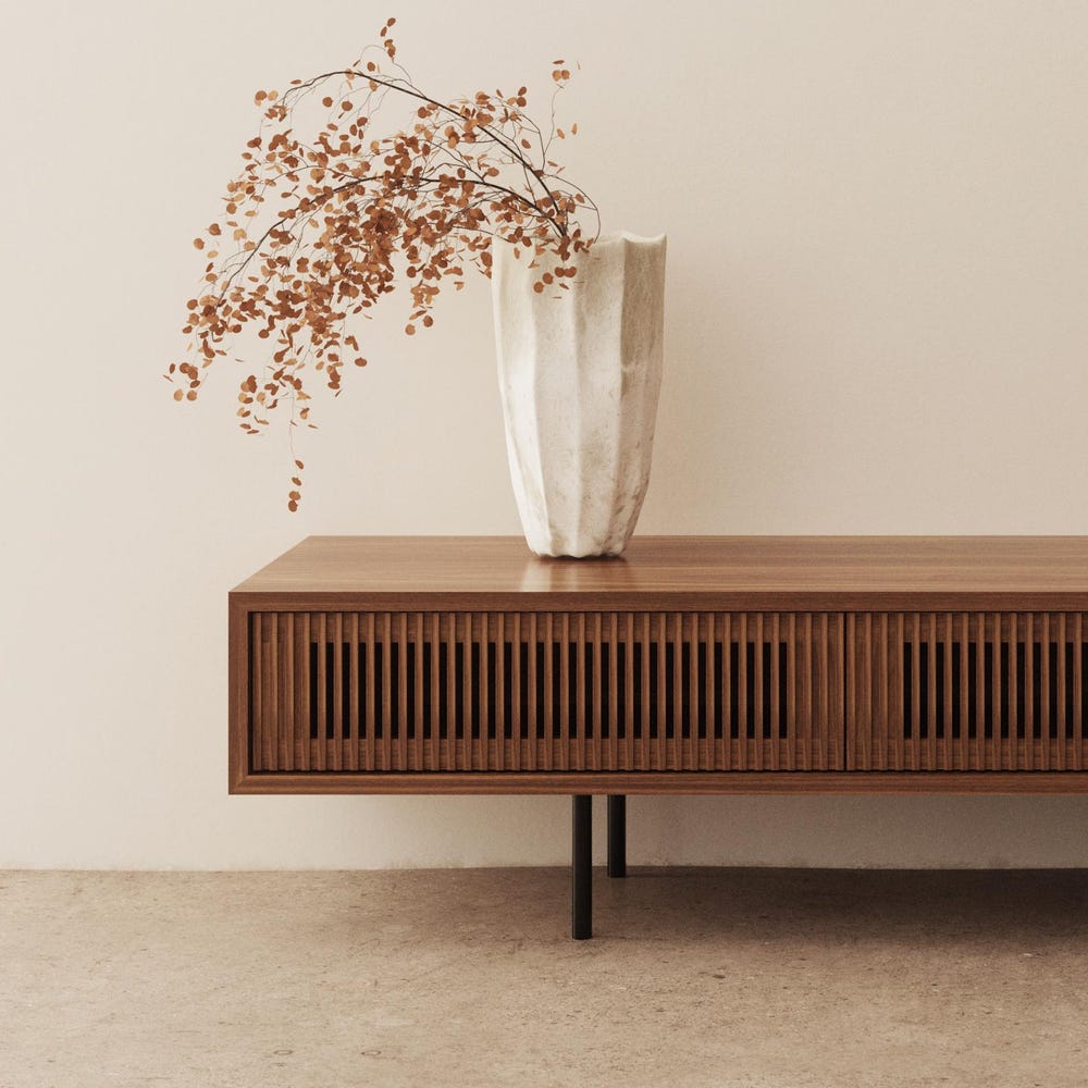 Walnut lowboard TV stand with three slatted doors in mid century modern style, media console, vinyl storage, audio storage, record player