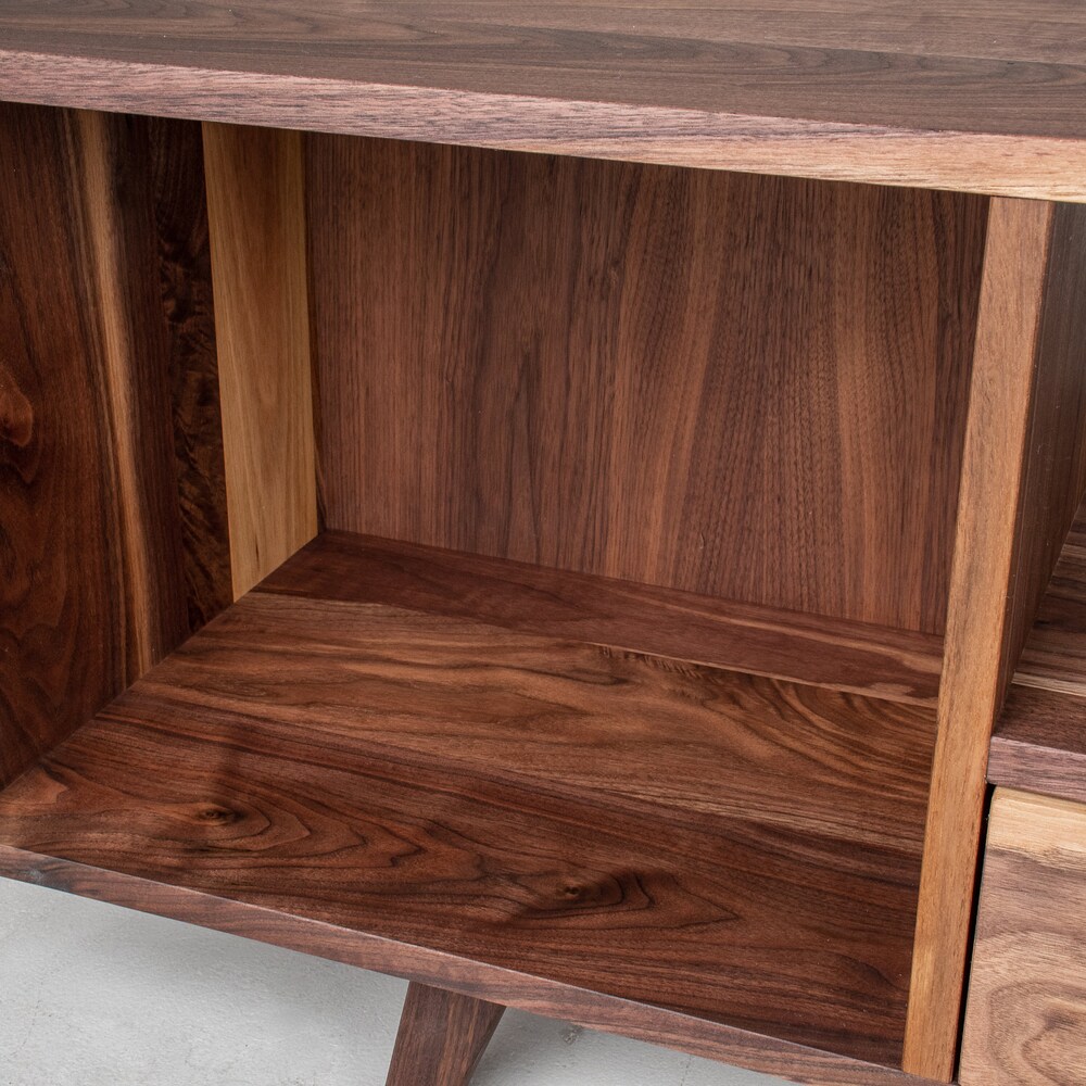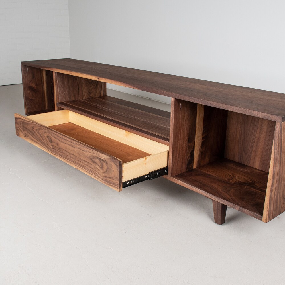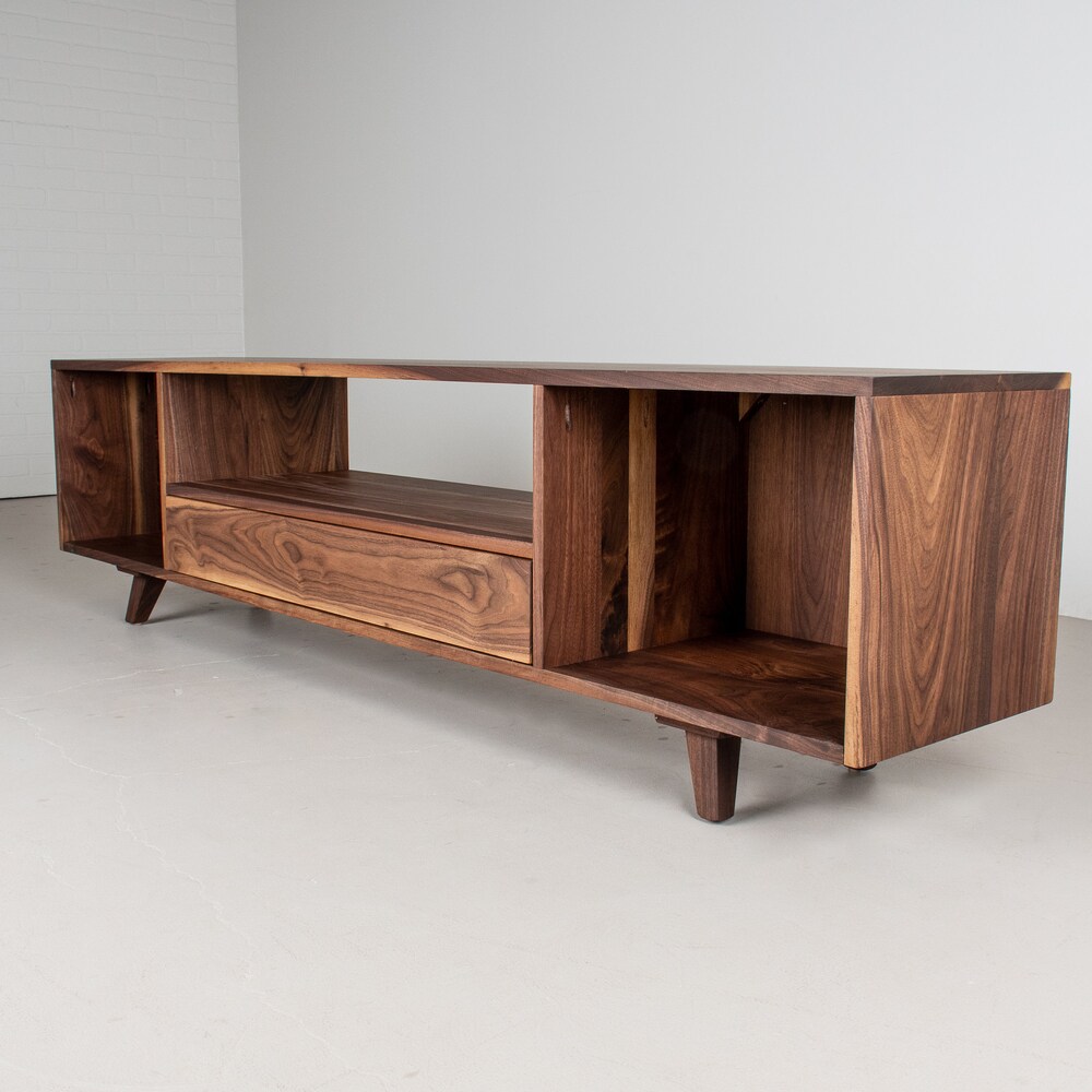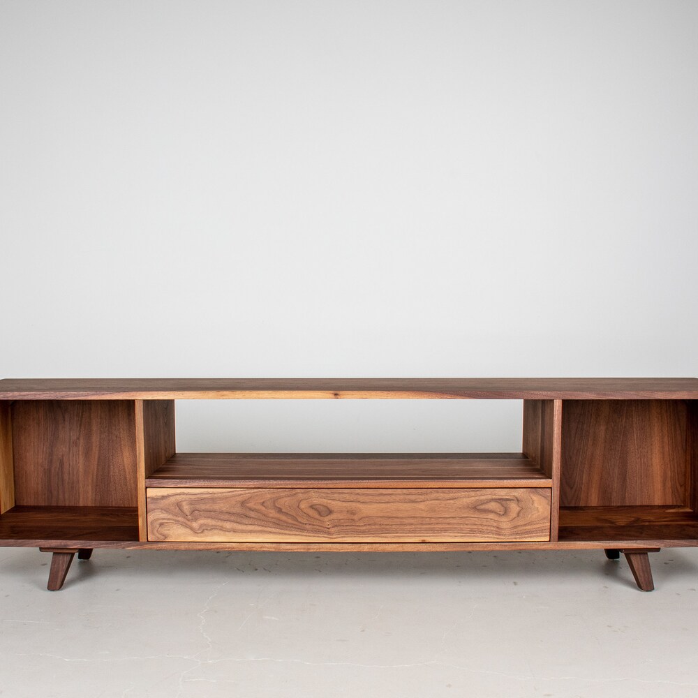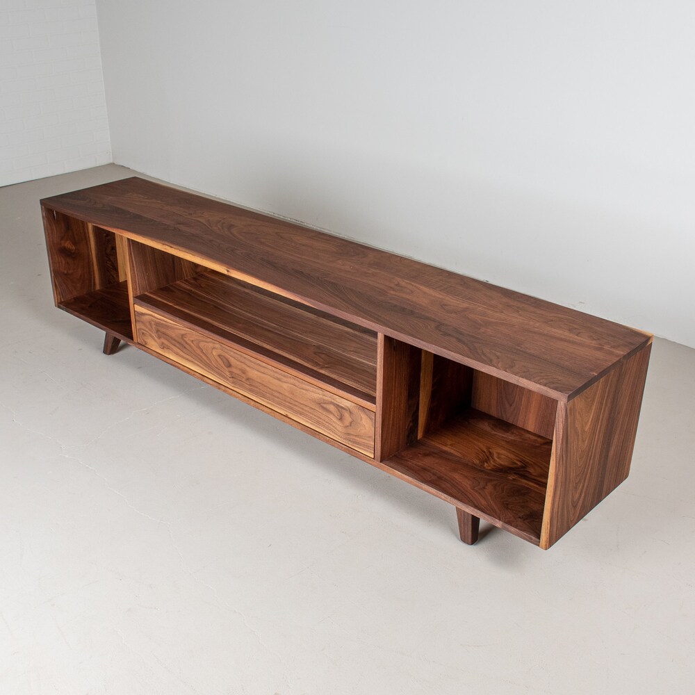This walnut media console is a beautiful, functional addition to a midcentury style living room. The range of tones in the walnut combined with the open shelves mean that this storage unit sits lightly in the space. The console as pictured is 76”W x 15”D x 20”H. We build every piece to order so there are many ways to make this table perfect for you.