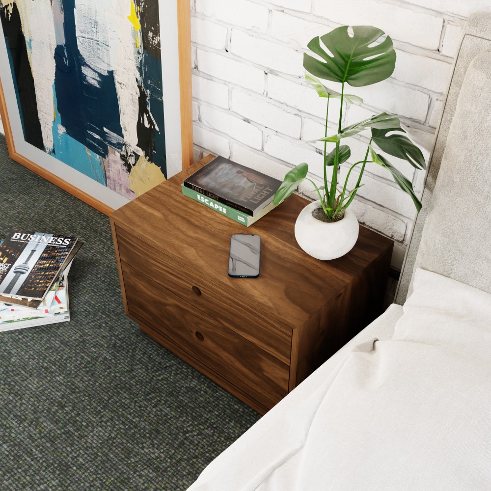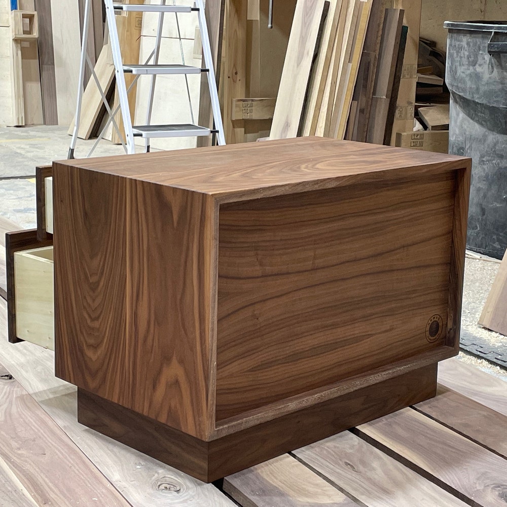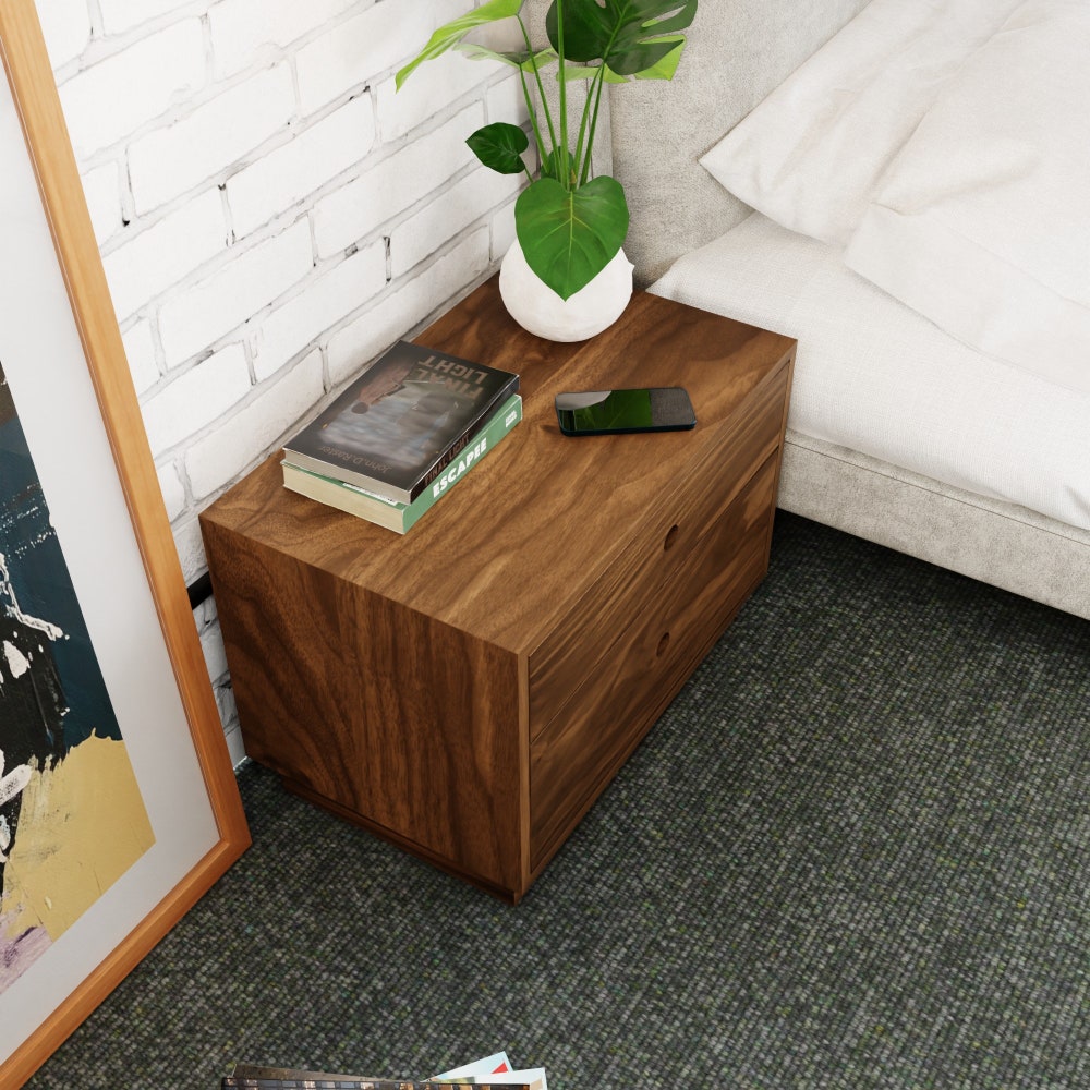 A Variation on our floating nightstand, this free standing oversized table is made to order in your custom sizing! Handmade from solid Walnut, these tables are built to last a lifetime. Use as a bedside table, End Table in the living room or even a mini dresser.