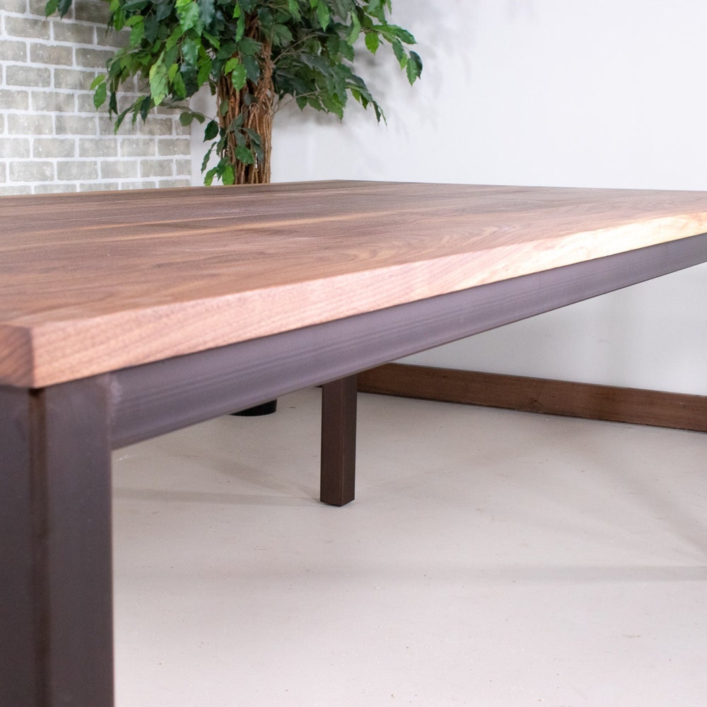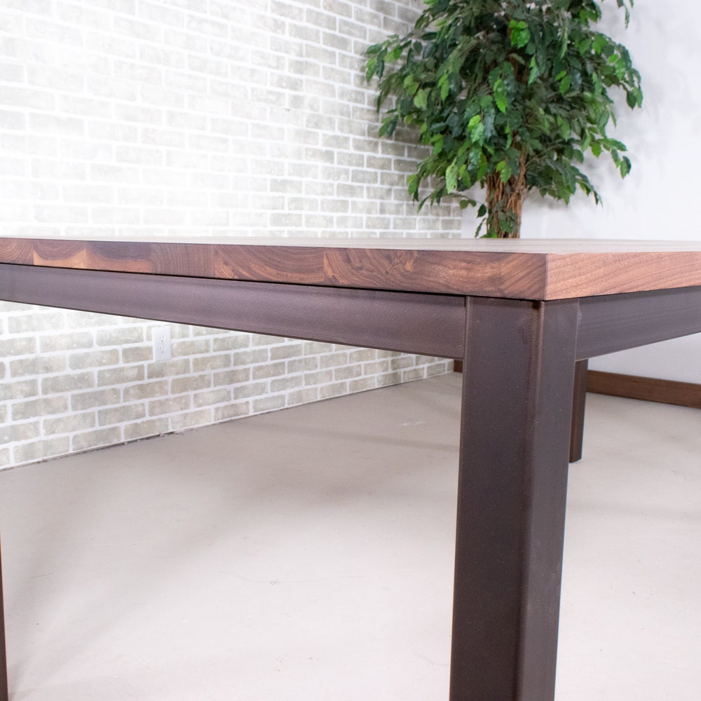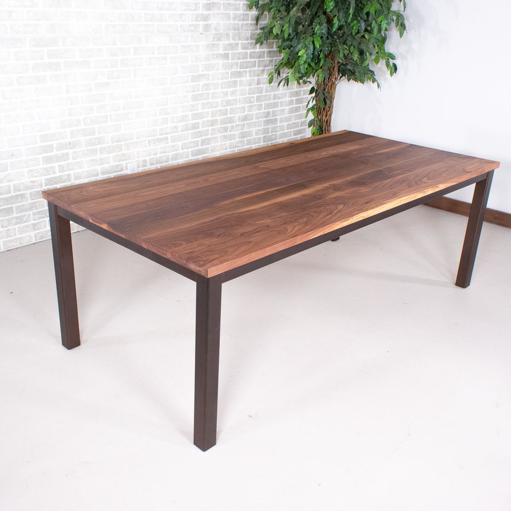 Walnut Parson Dining Table on Burnt Penny Steel Base, Walnut Dining Table Top on Colored Steel Base, Steel Parsons Dining Table