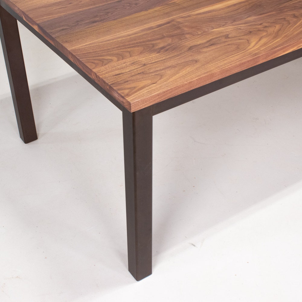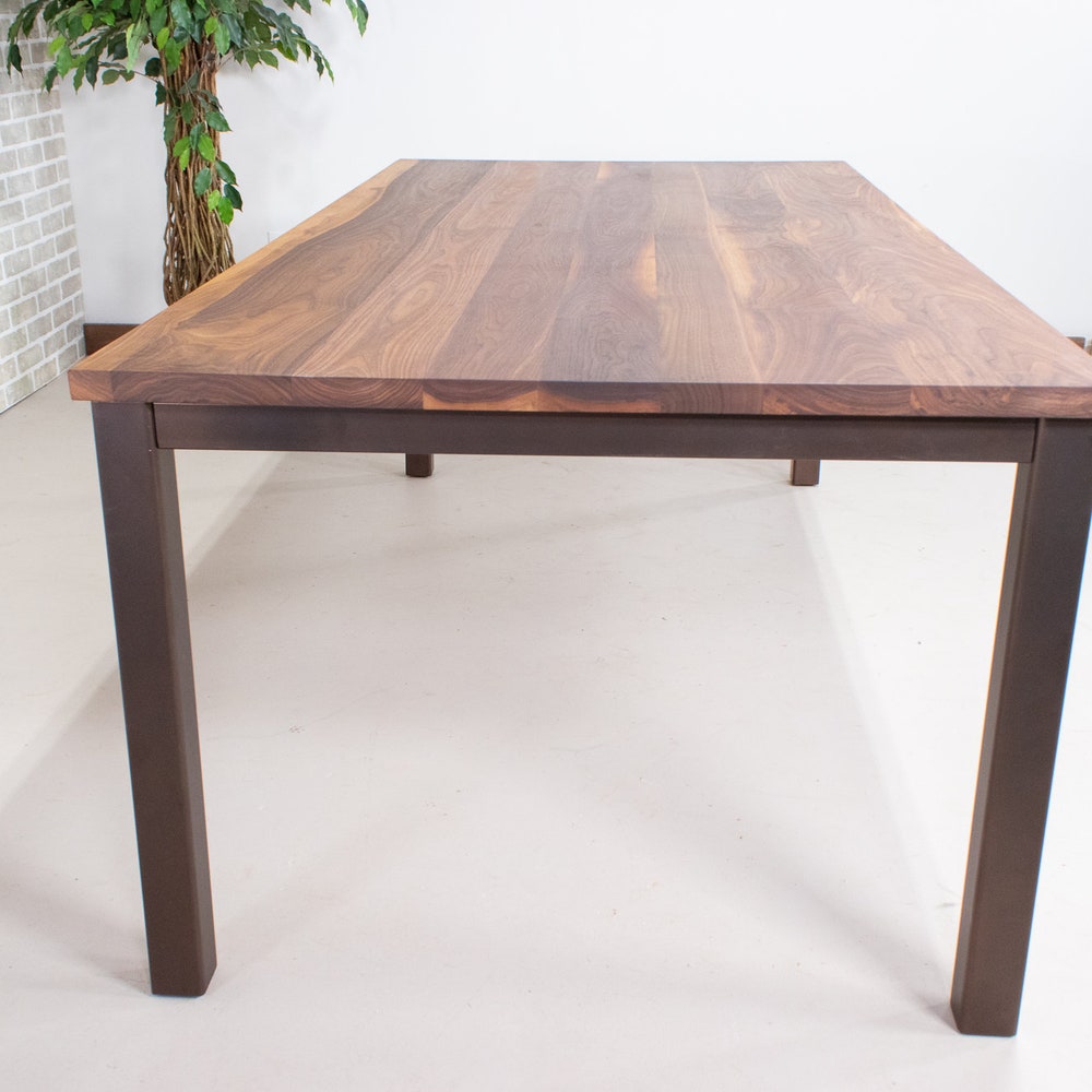 Add a touch of sophistication to your dining room with this parson dining table. The burnt penny colored steel base pulls out the coppery tones in the walnut to highlight the rich tones in the wood. We build every table to order so there are many ways to make this table perfect for you.