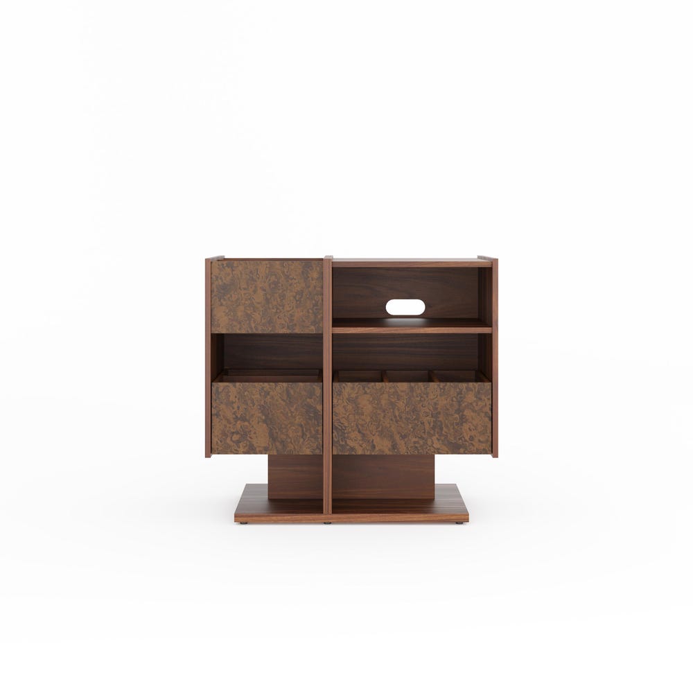 Walnut record player stand with with walnut burl fronts in mid century modern style.