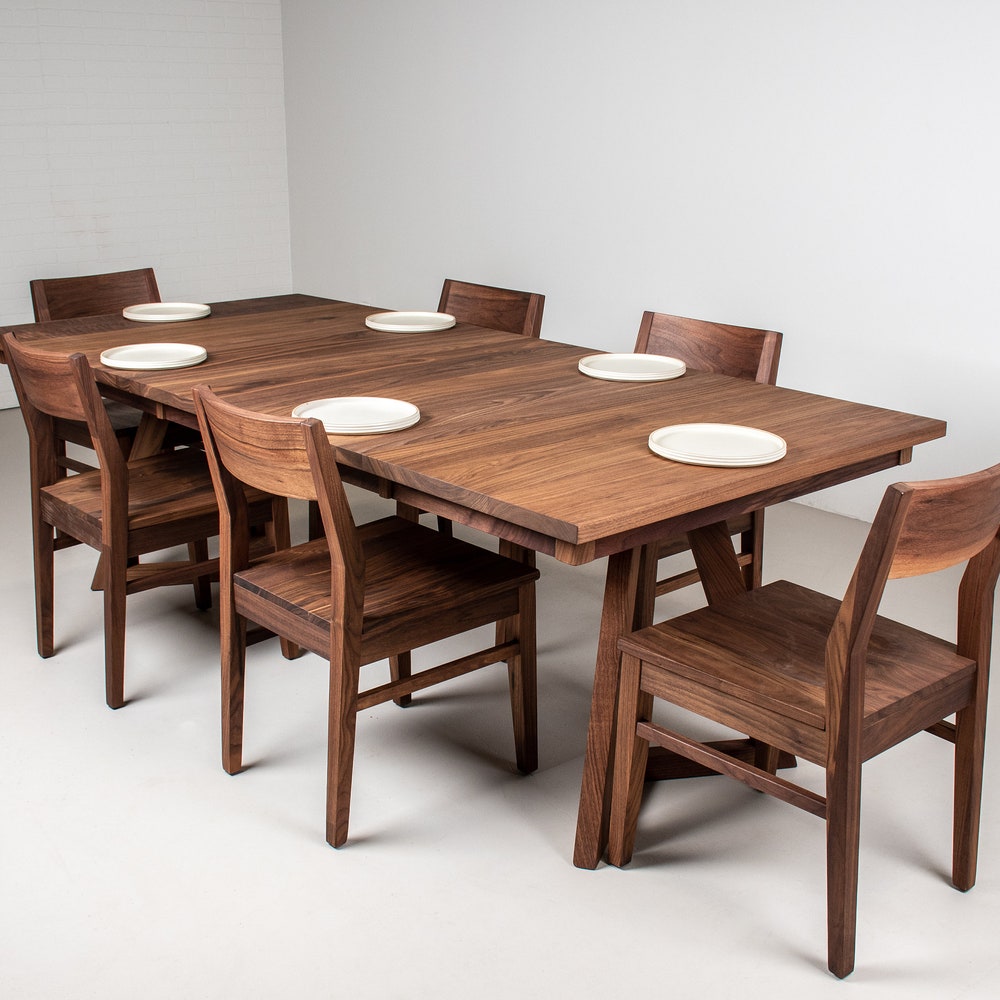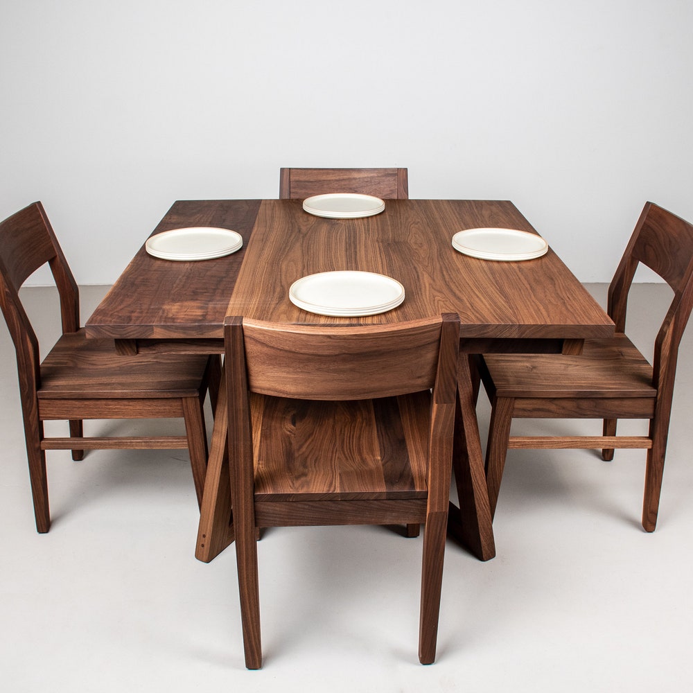 A square walnut dining table with extensions like this one allows you to always be ready for a few extra people around the table. The core table looks great for everyday use – and the leaves are easily added to the center to accommodate a few more people. We build every table to order so there are many ways to make this table perfect for you.