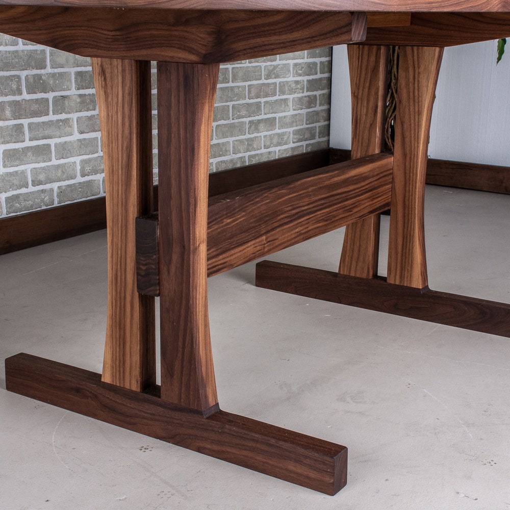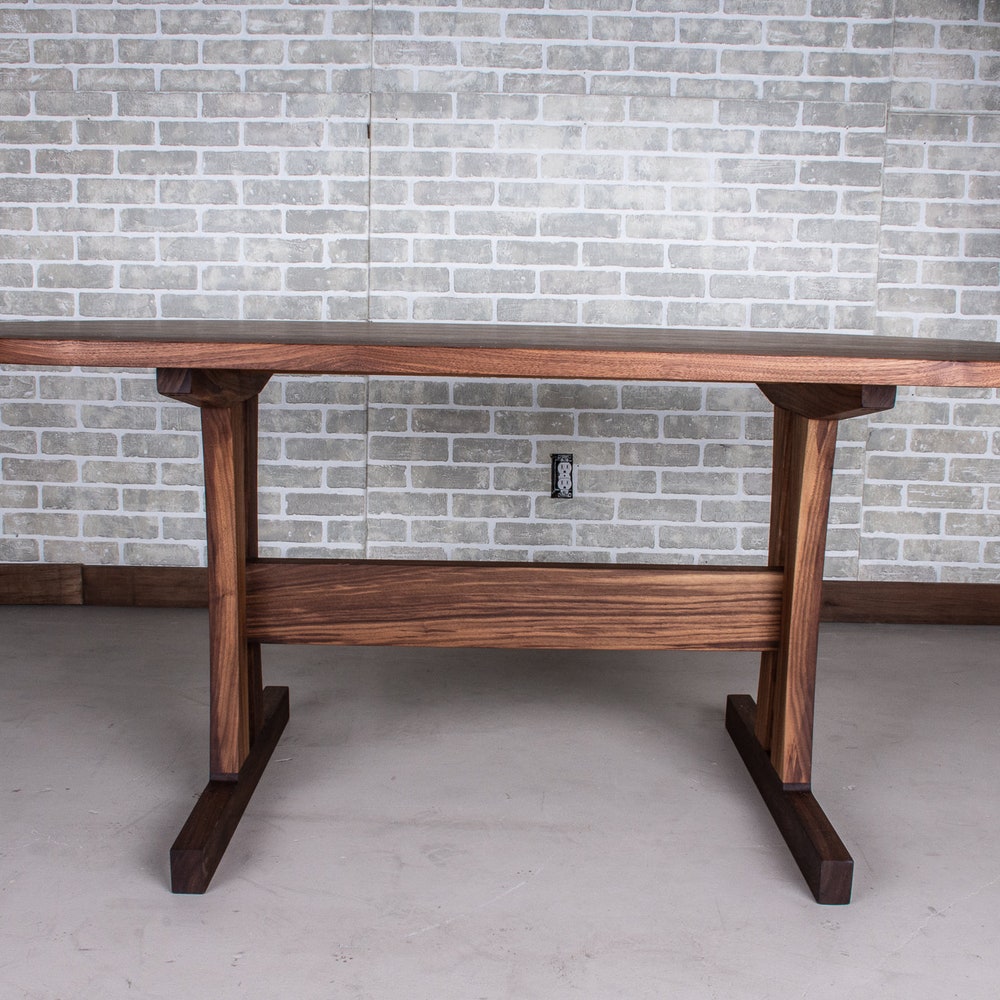 Upgrade your farmhouse dining room with a walnut trestle table. A trestle base is a classic design for a farmhouse table and the walnut wood elevates this design. A trestle base is a popular choice because it allows space for legs under the table. We build every table to order so there are many ways to make this table perfect for you.