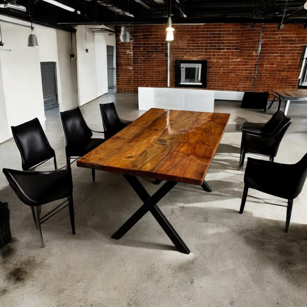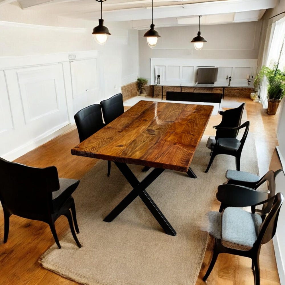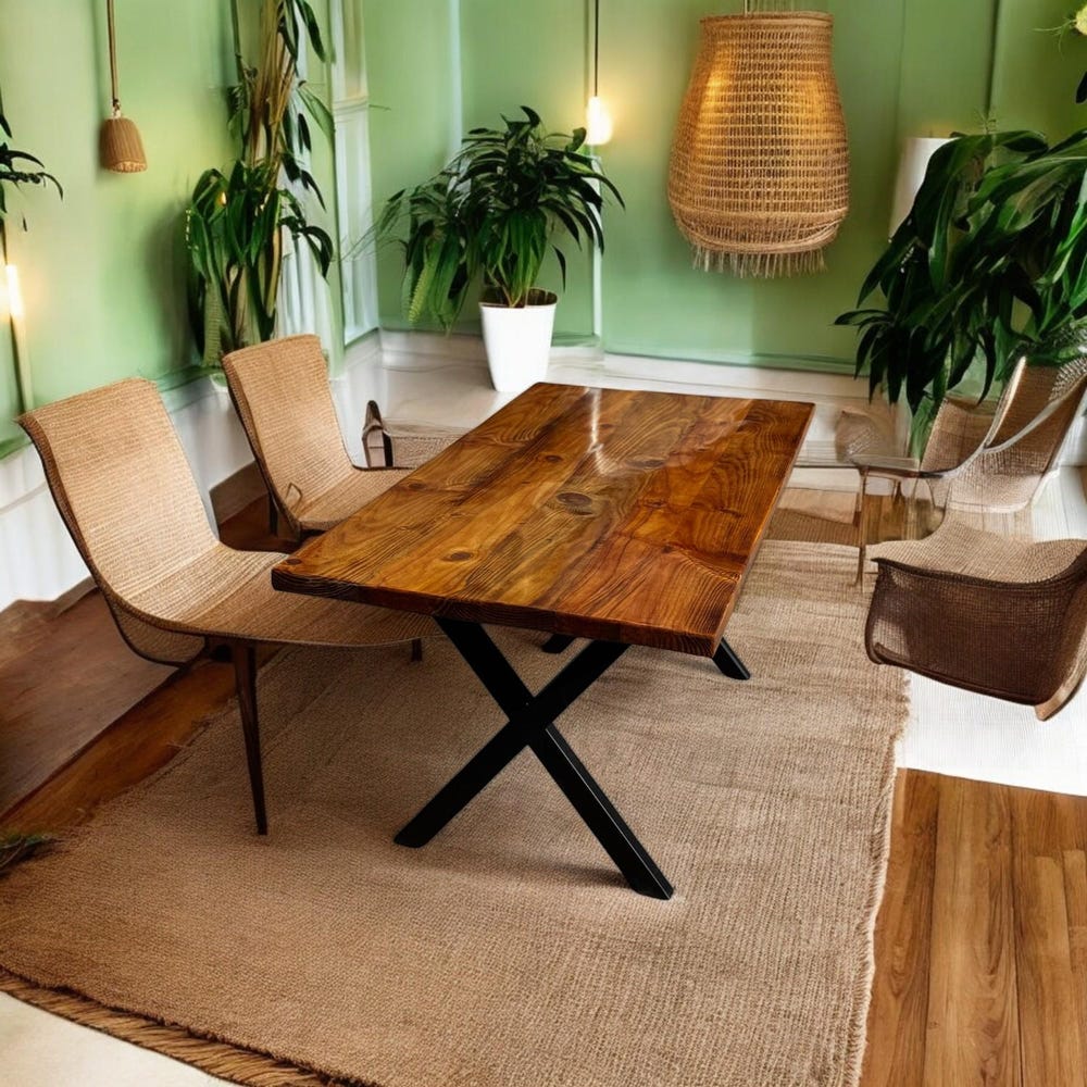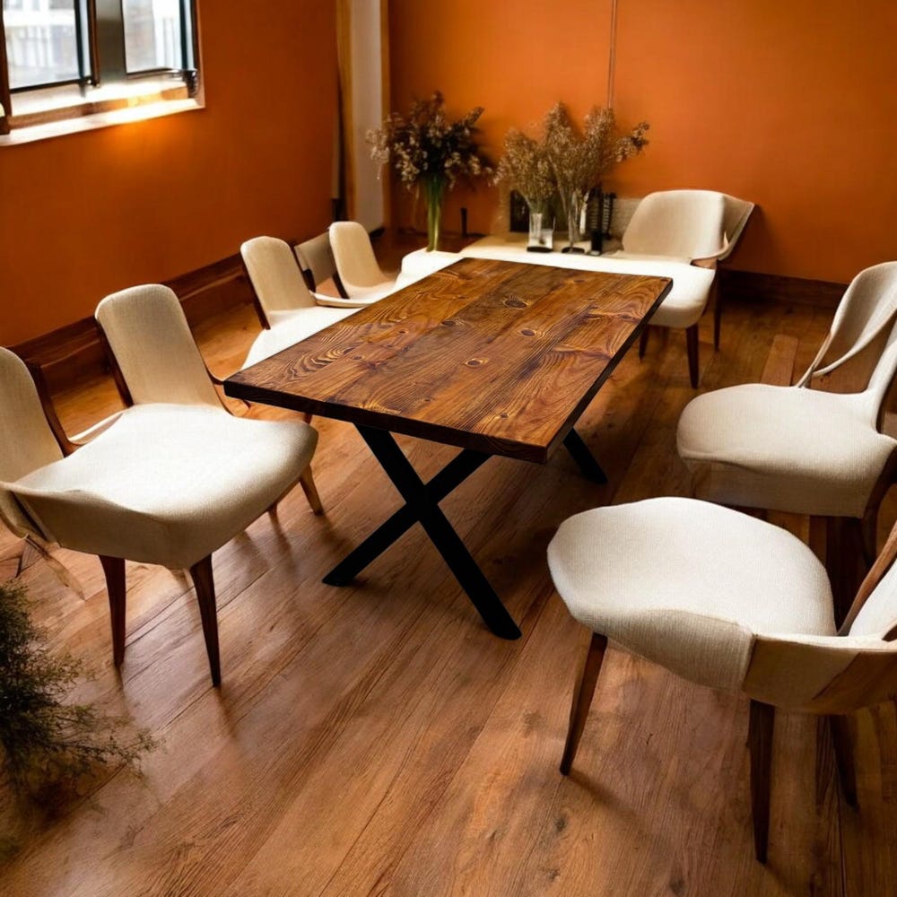 This isn’t just a wooden dining table—it’s the heart of your home. It’s where morning coffees are shared, family stories are told, and memories are made. Designed for both style and function, the table features industrial steel legs in a bold X-shaped design, offering sturdy support and a modern rustic aesthetic.