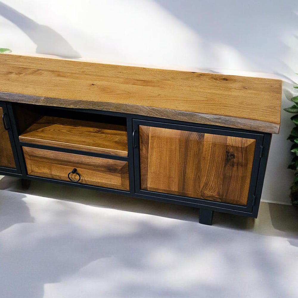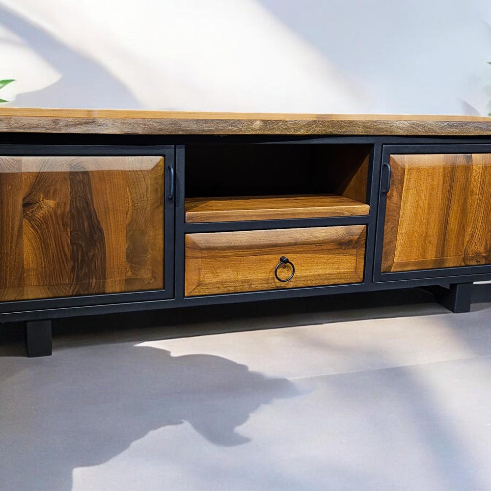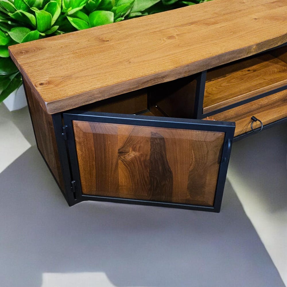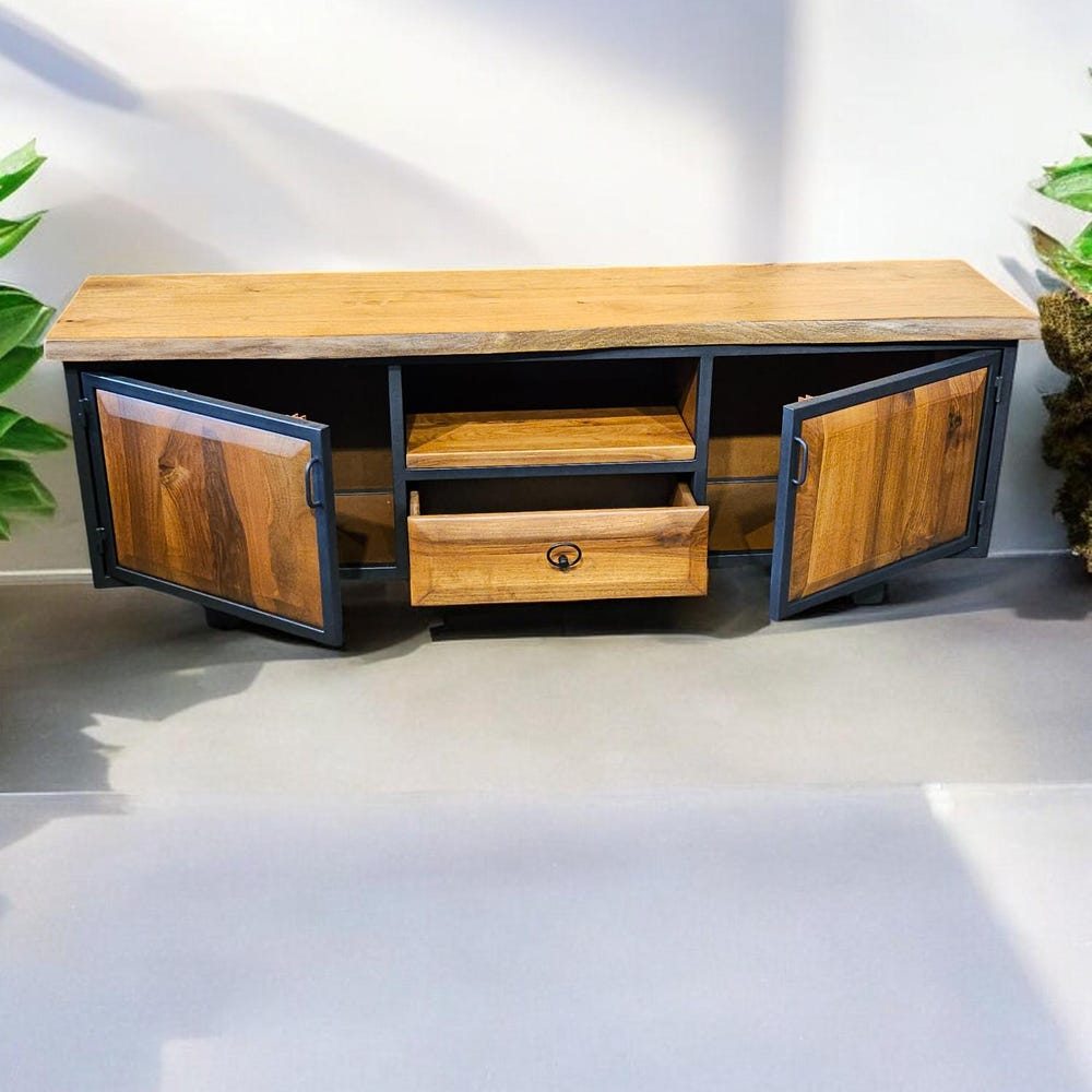 Our handcrafted console storage unit brings together elegance and practicality, made from 100% natural wood and durable iron accents. This unit offers a spacious area that can be used as a stylish TV stand or a storage solution.