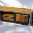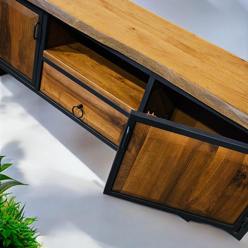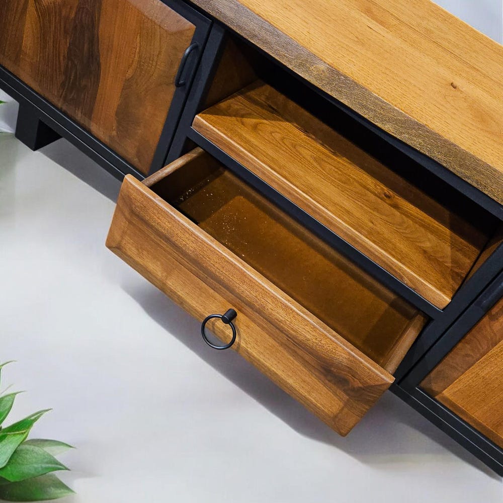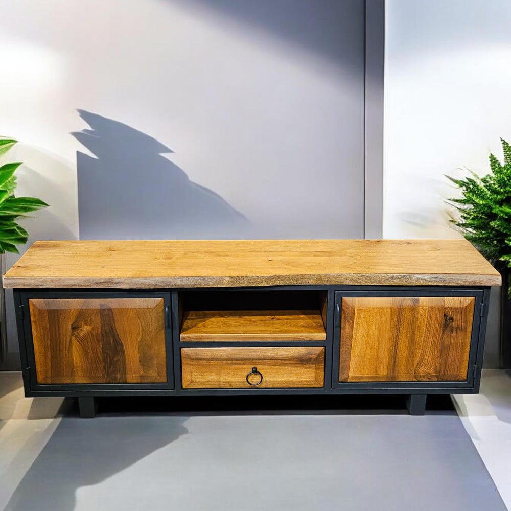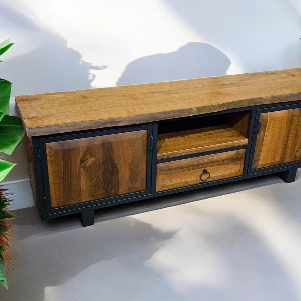 Our handcrafted console storage unit brings together elegance and practicality, made from 100% natural wood and durable iron accents. This unit offers a spacious area that can be used as a stylish TV stand or a storage solution.
