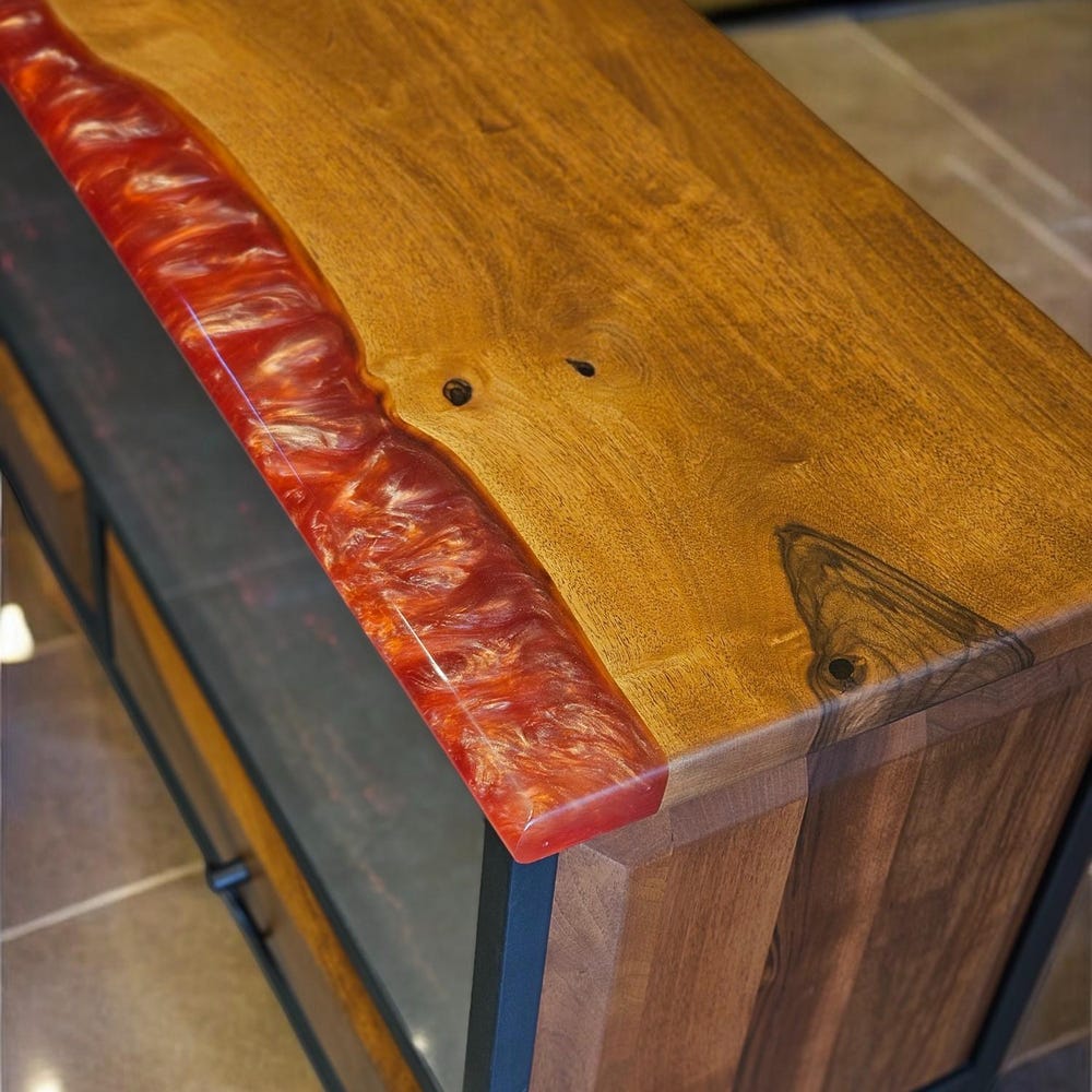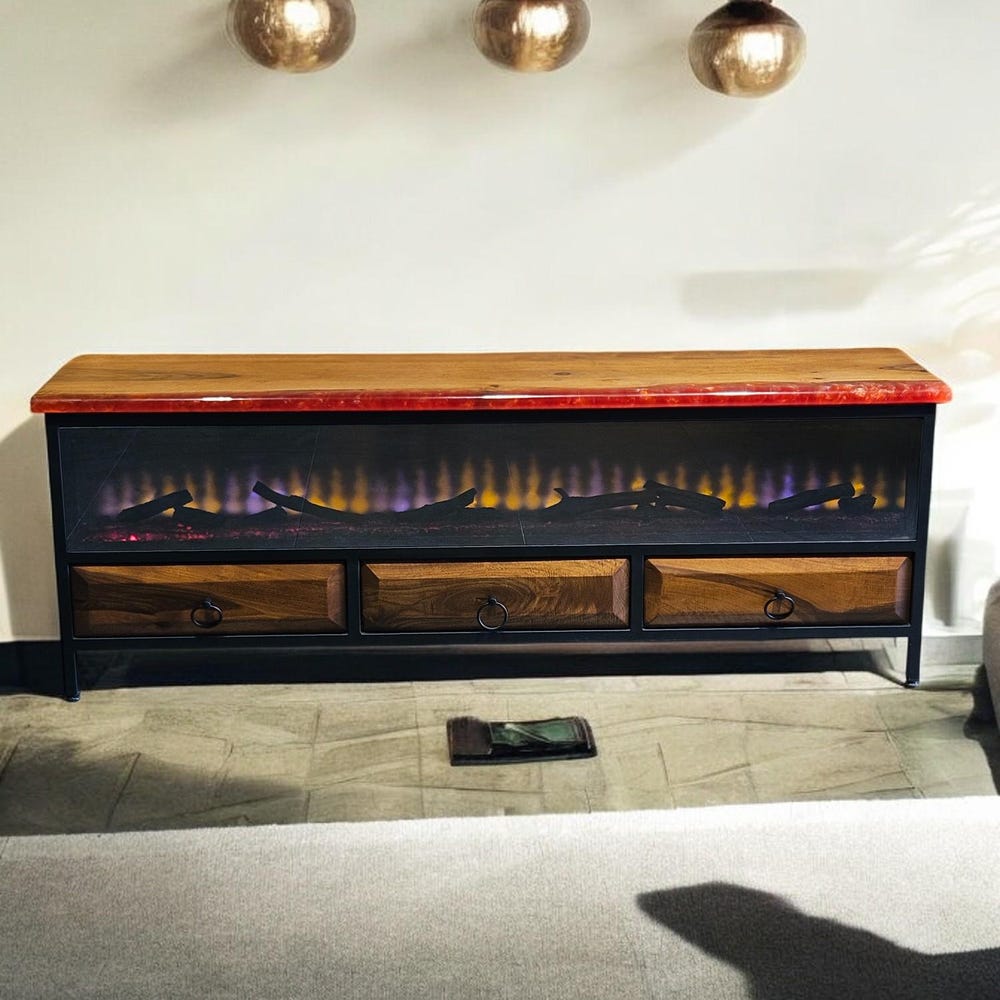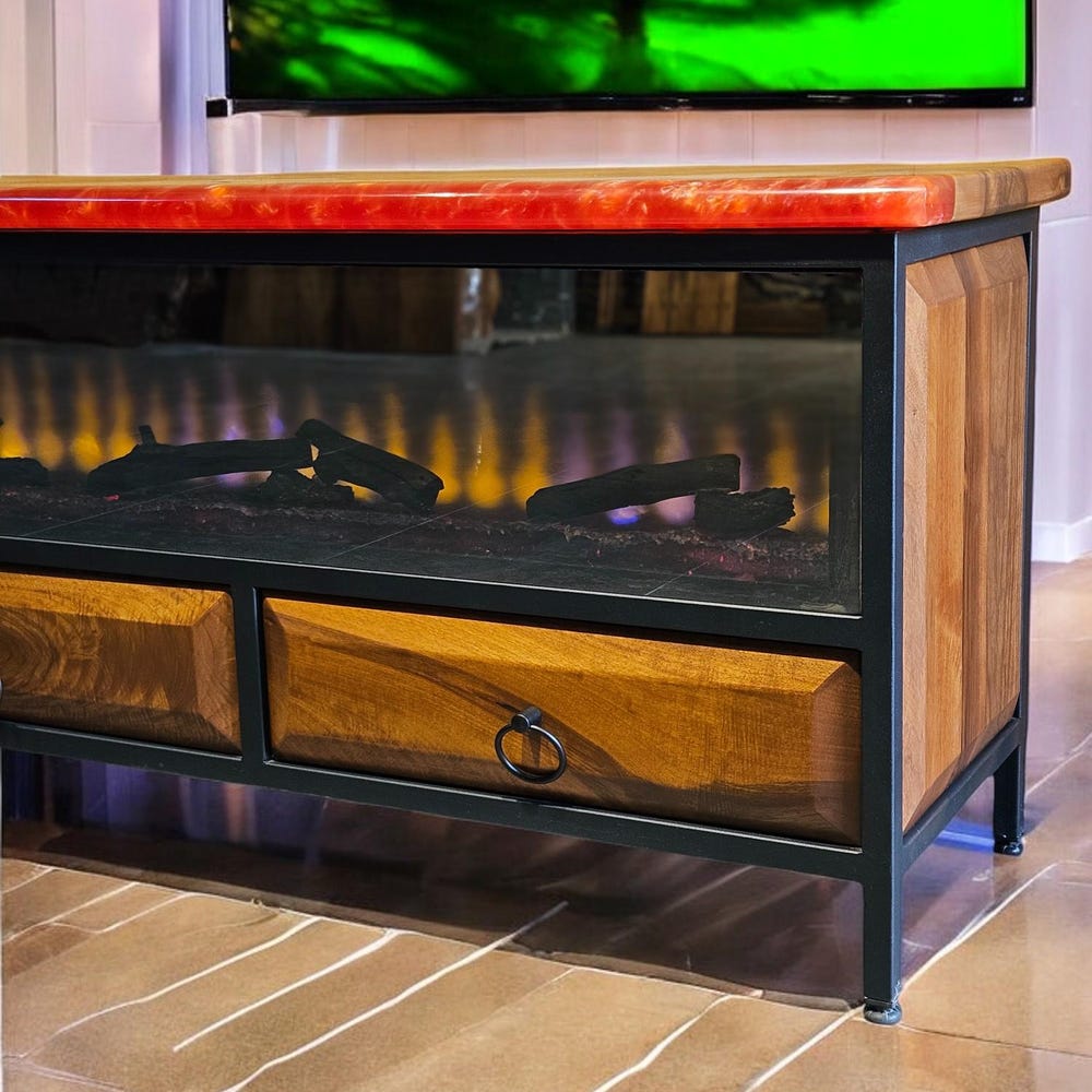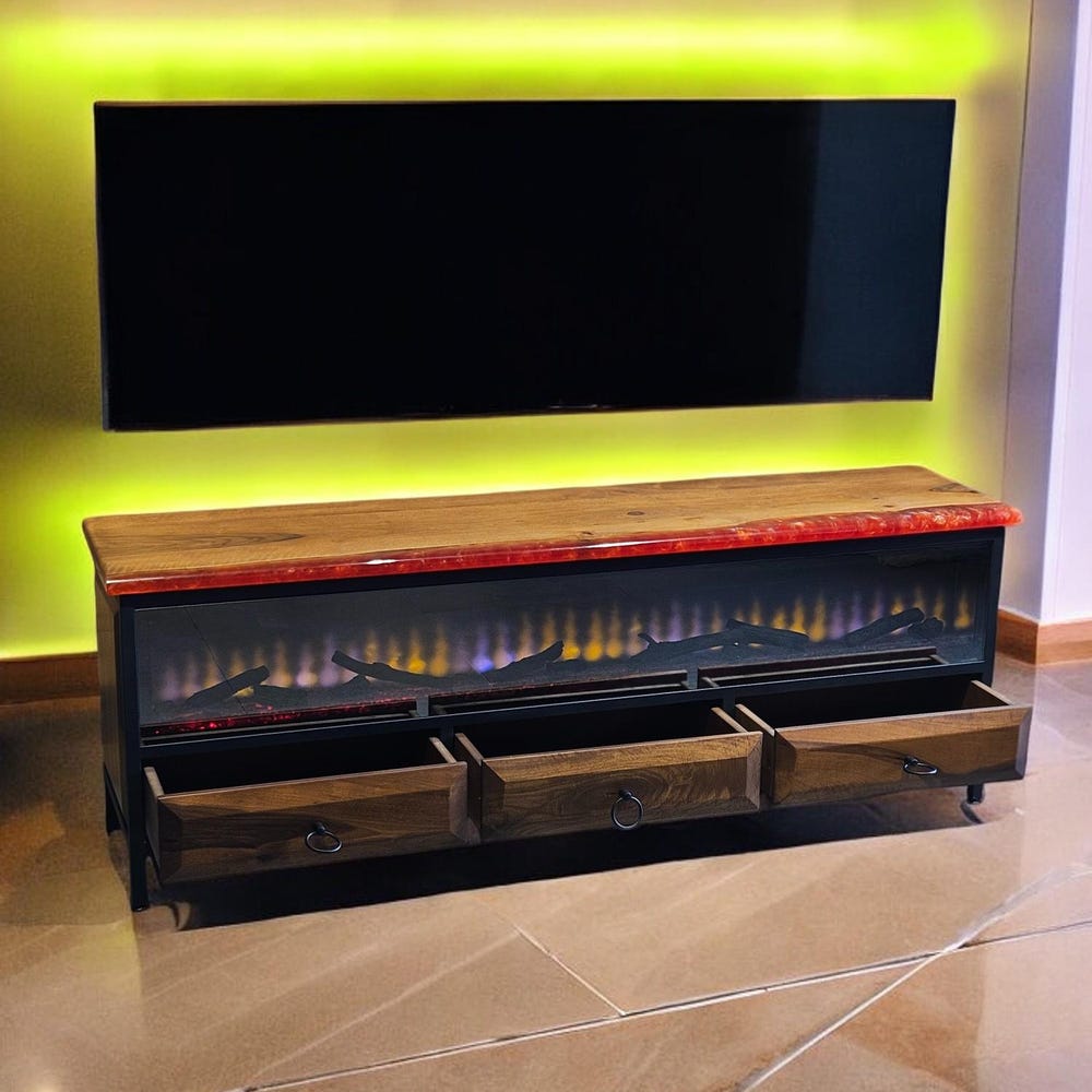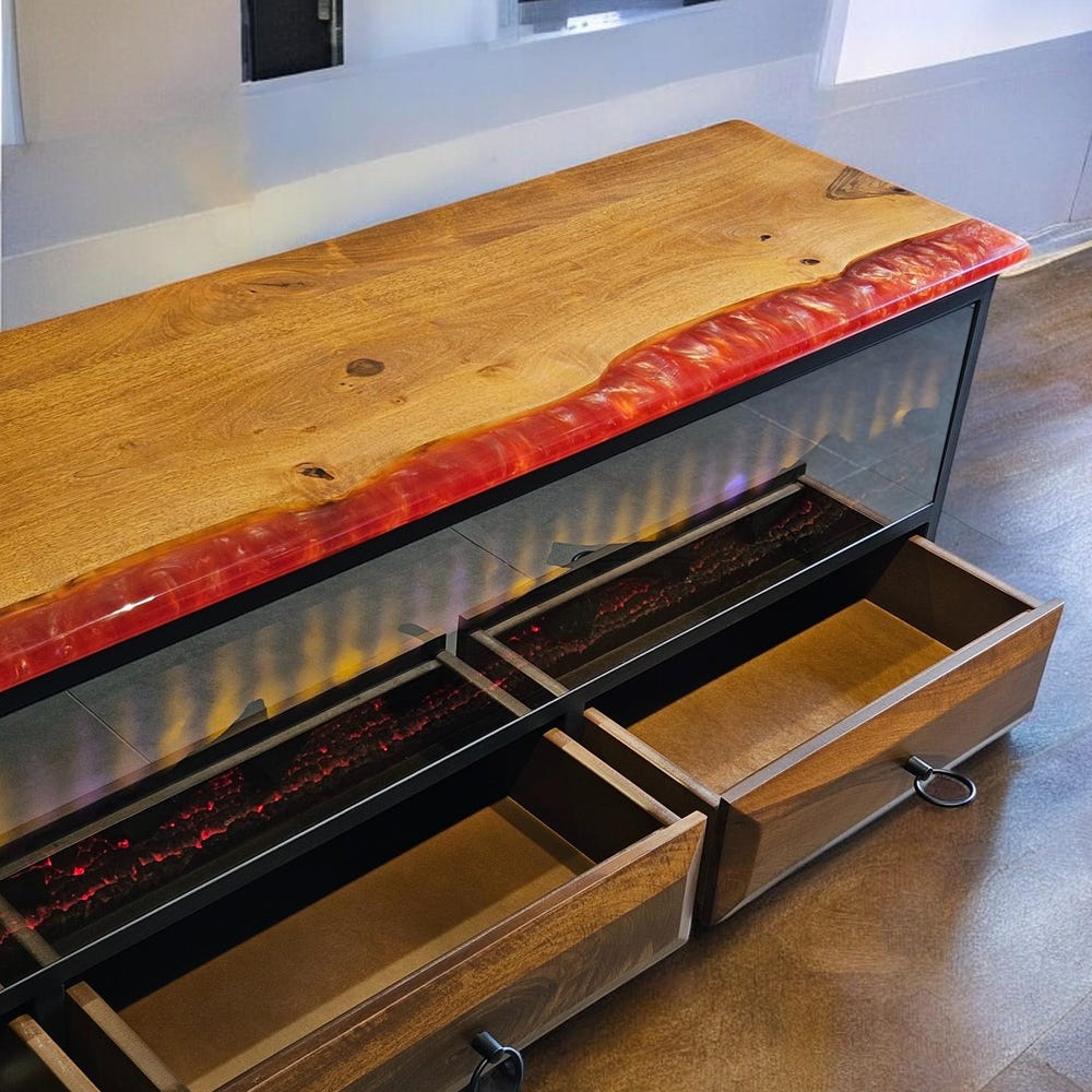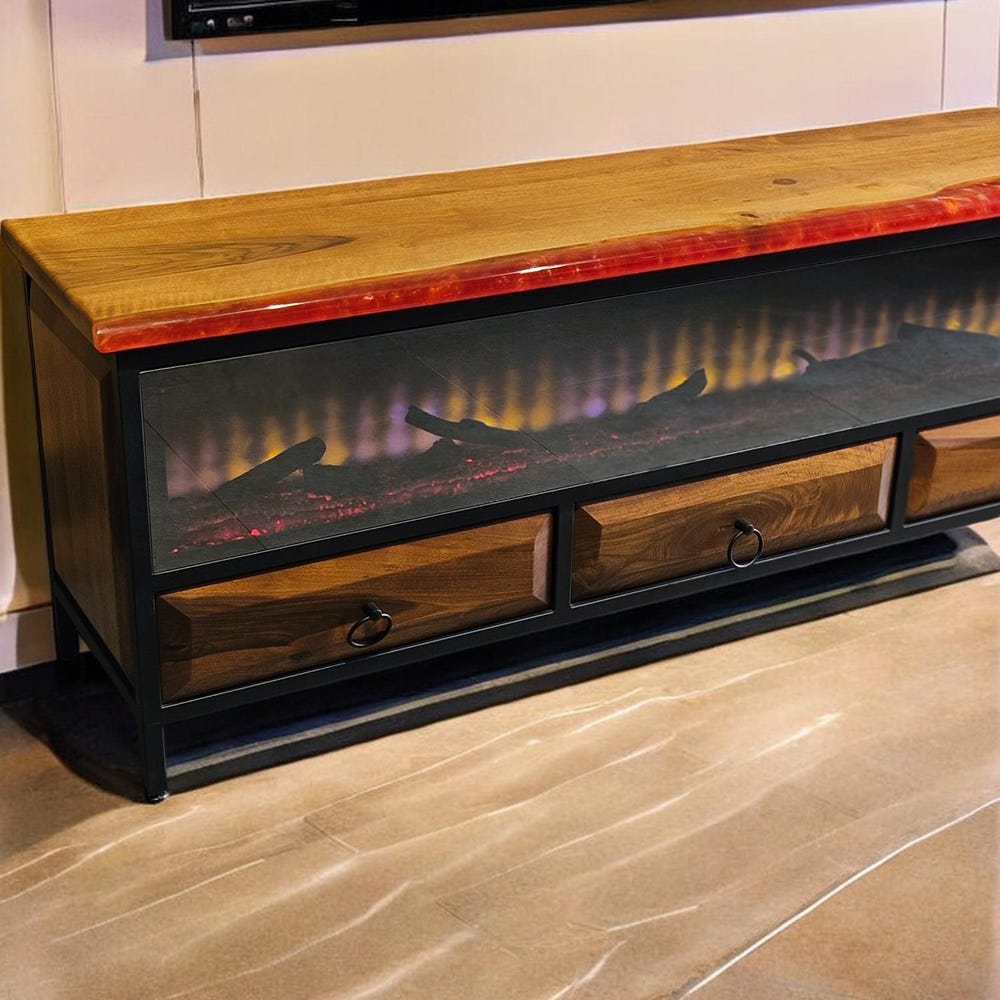 Our handcrafted TV unit, made from premium walnut wood and epoxy, features a built-in digital fireplace, blending warmth and sophistication. This unique piece provides a stylish and functional solution for your living room.