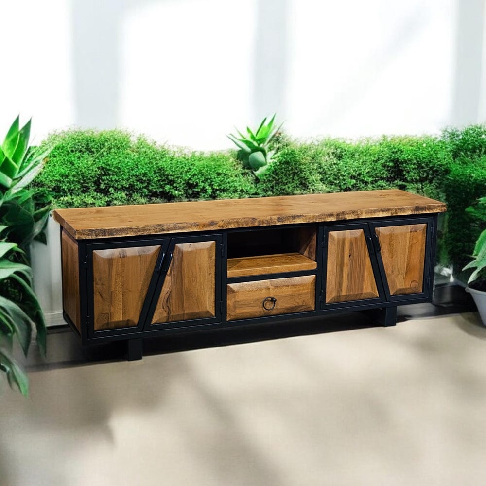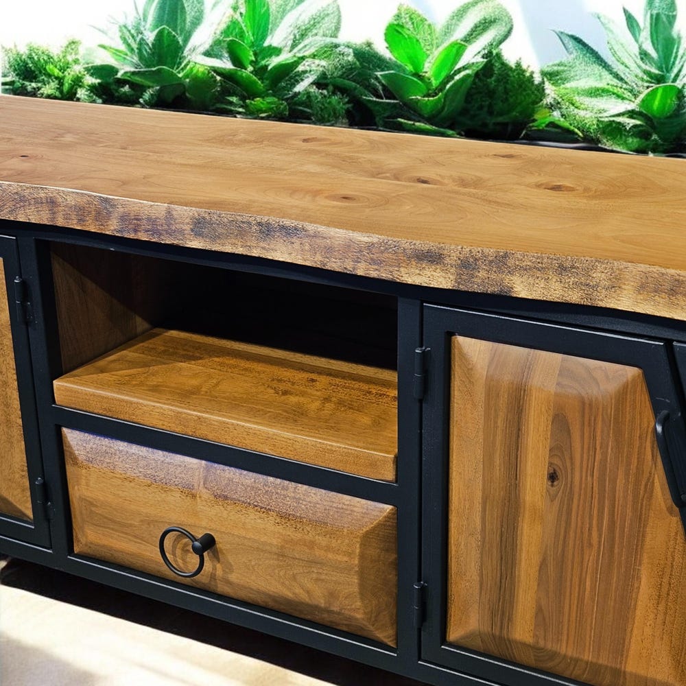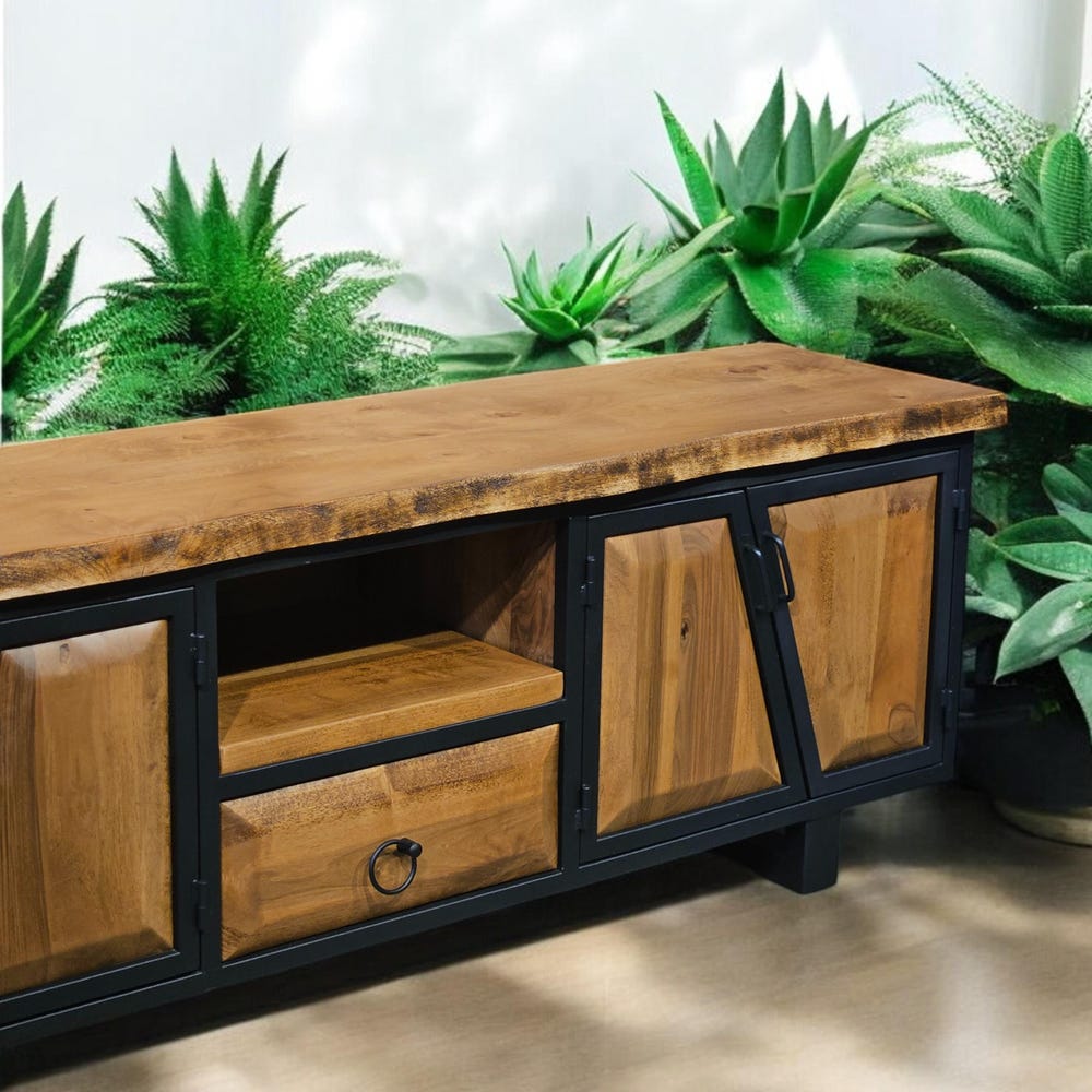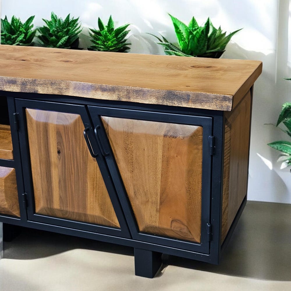 Our handcrafted console storage unit brings together elegance and practicality, made from 100% natural wood and durable iron accents. This unit offers a spacious area that can be used as a stylish TV stand or a storage solution.