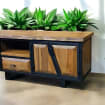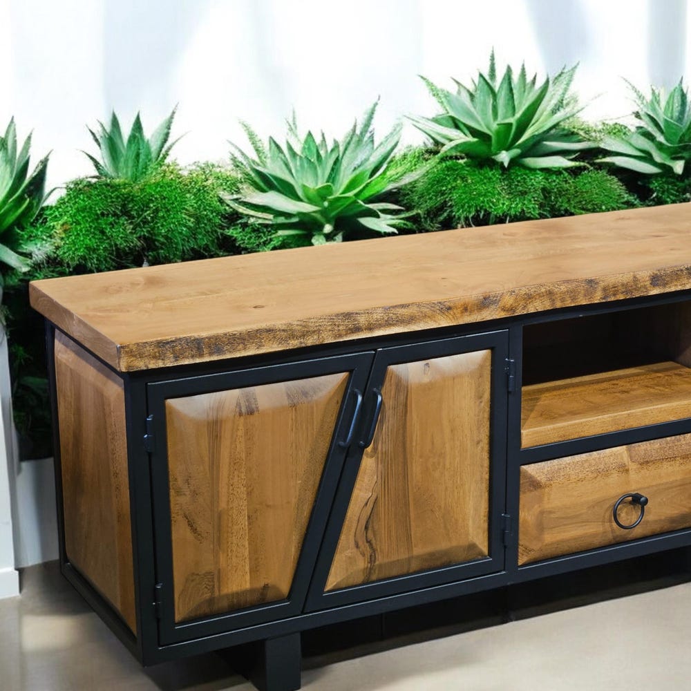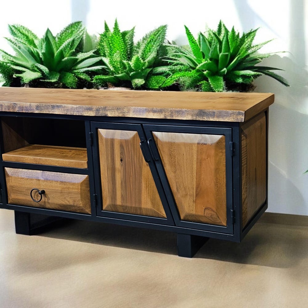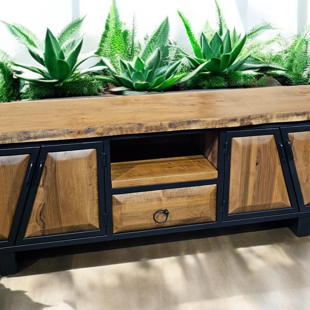Our handcrafted console storage unit brings together elegance and practicality, made from 100% natural wood and durable iron accents. This unit offers a spacious area that can be used as a stylish TV stand or a storage solution.