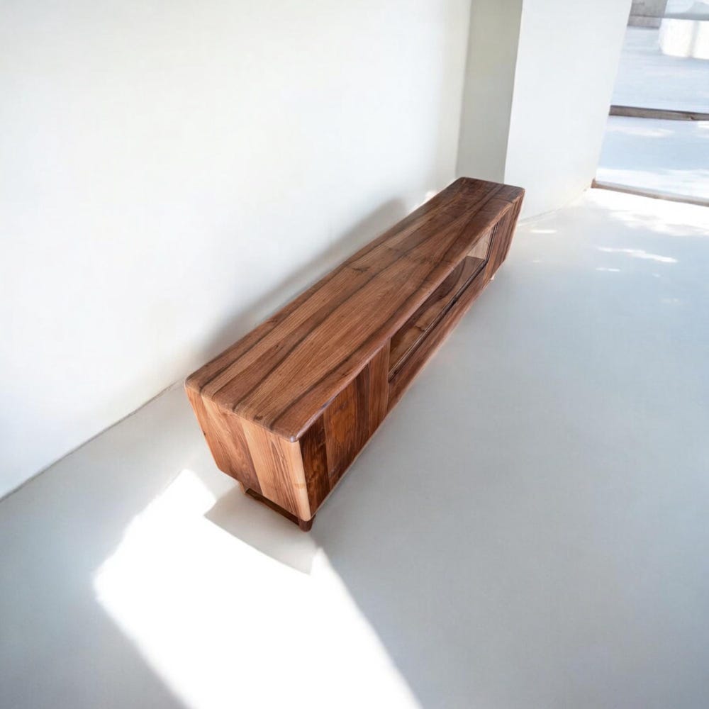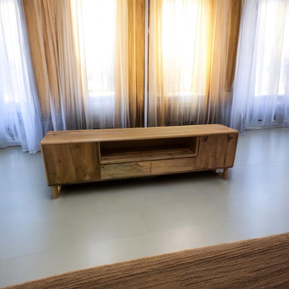 Our handcrafted console storage unit brings together elegance and practicality, made from 100% natural wood and durable iron accents. This unit offers a spacious area that can be used as a stylish TV stand or a storage solution.