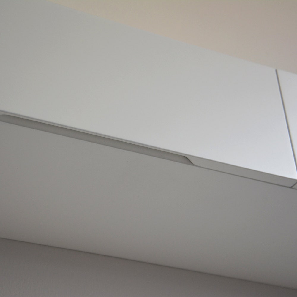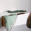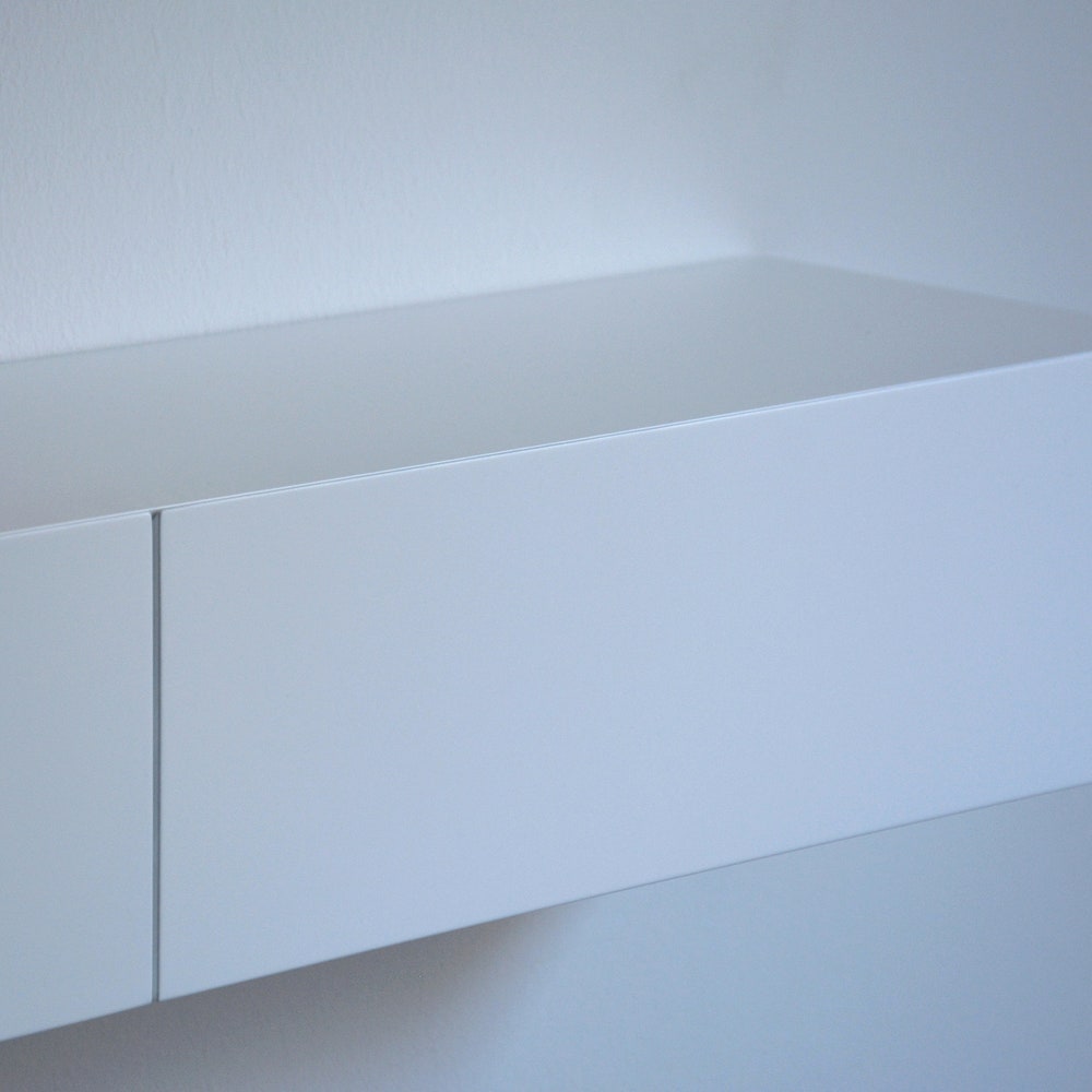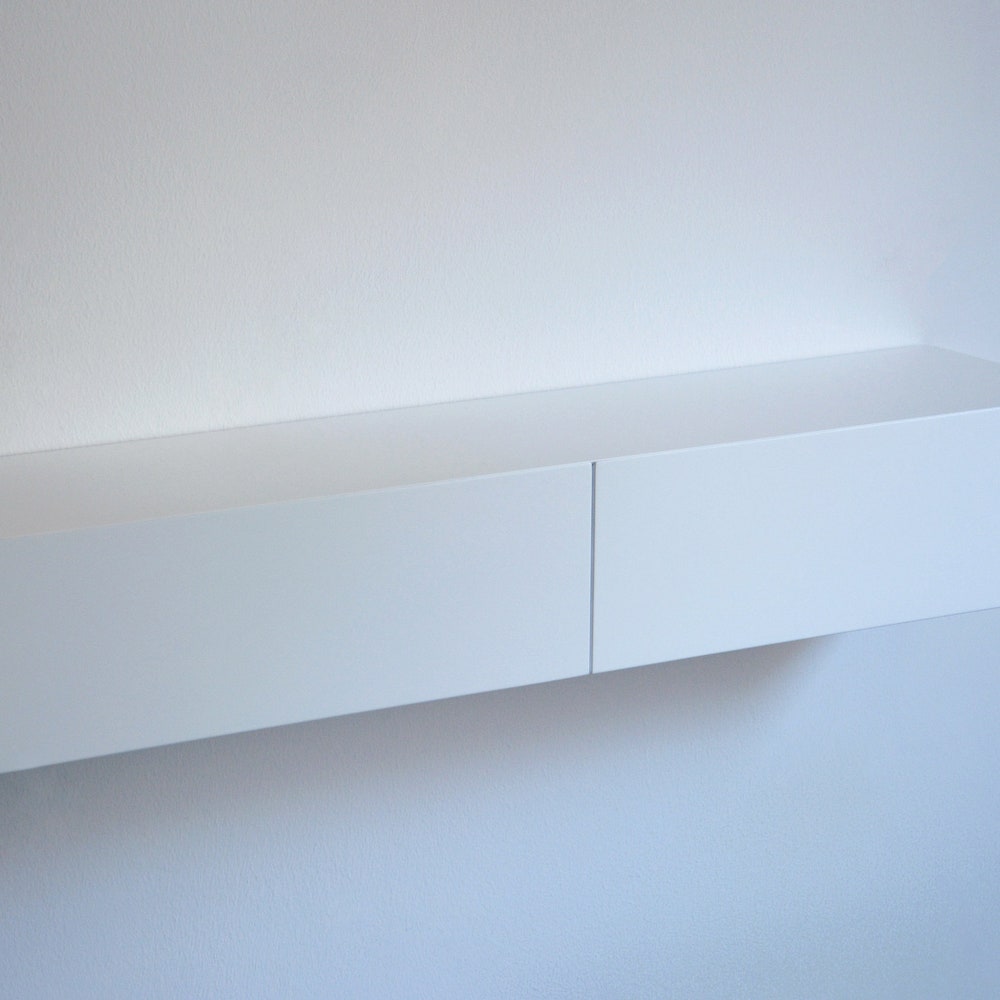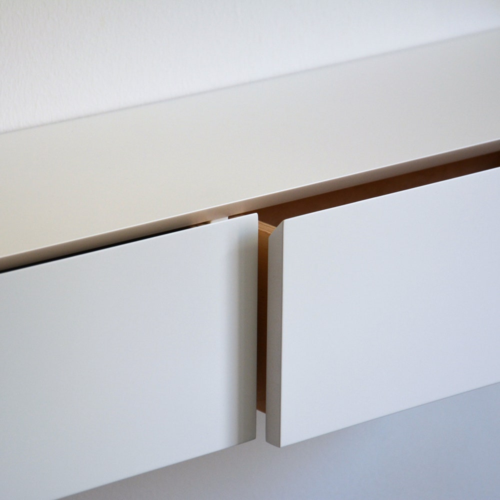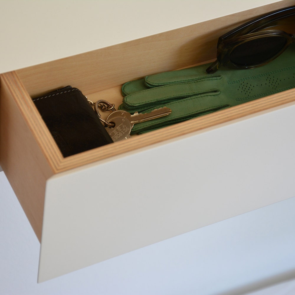 White floating entryway shelf / narrow entryway table with hidden drawers