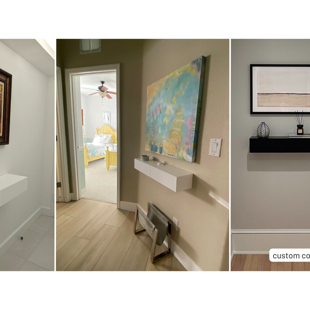 Looking for a narrow entryway table? This floating entryway shelf will be a great alternative to entryway tables, as it wont’t take any space away from your entryway. It is ideal for tiny spaces and narrow entryways for space-saver storage.