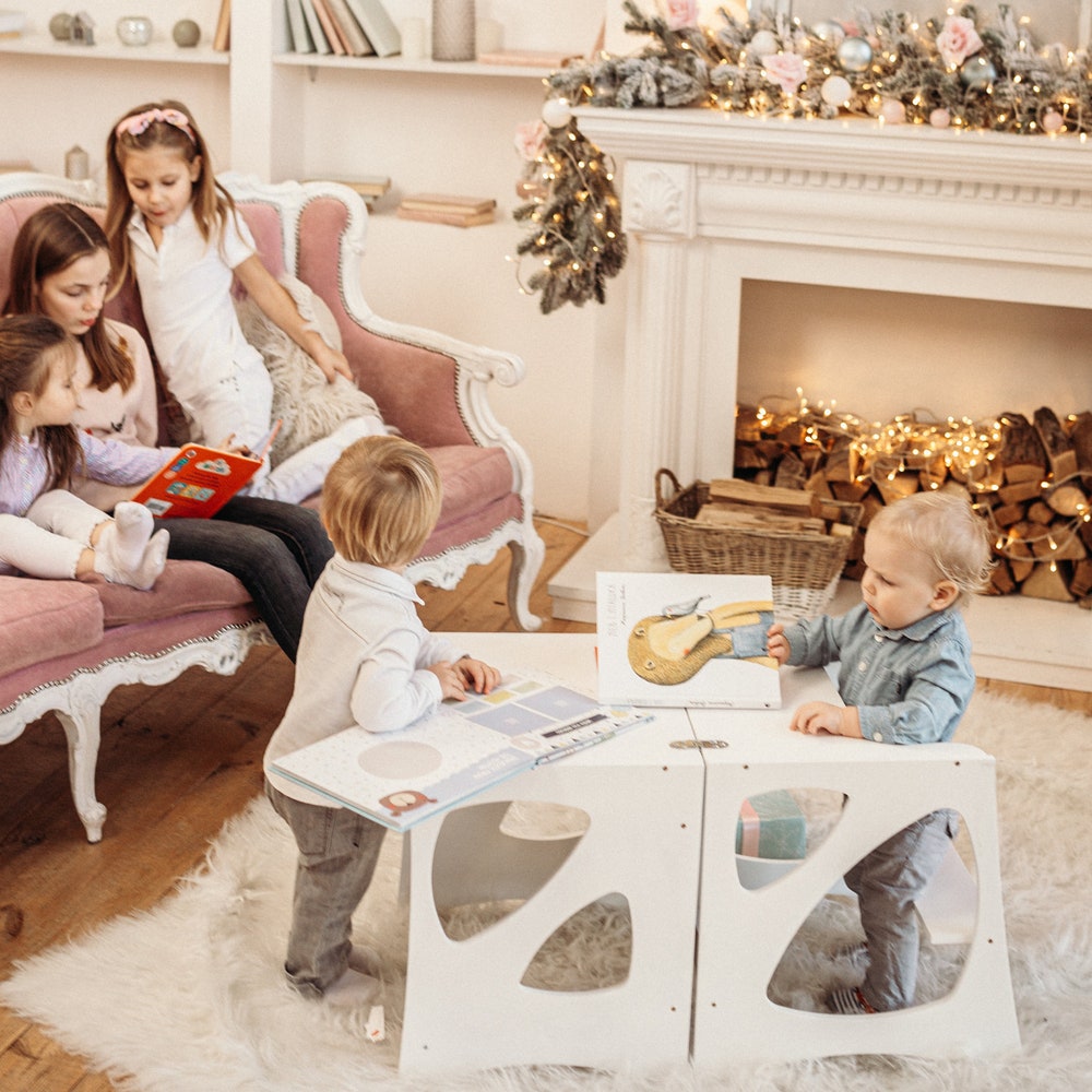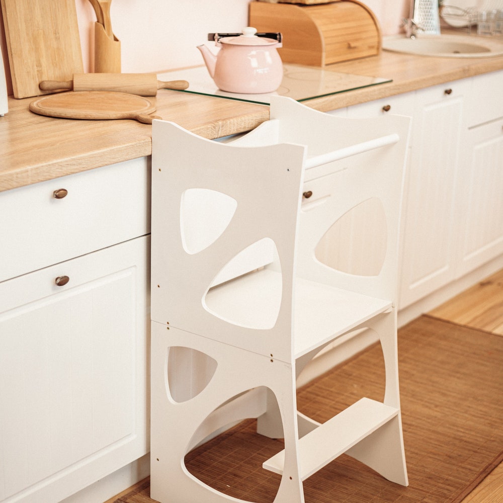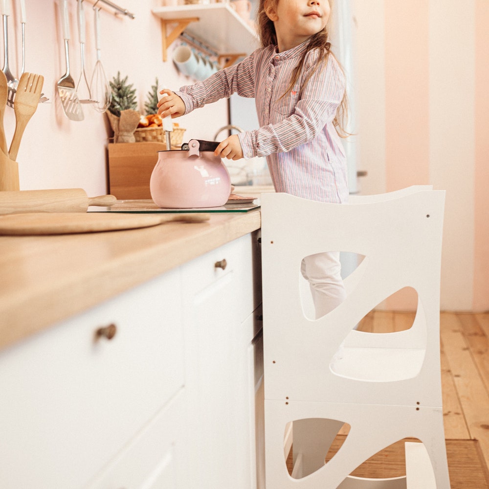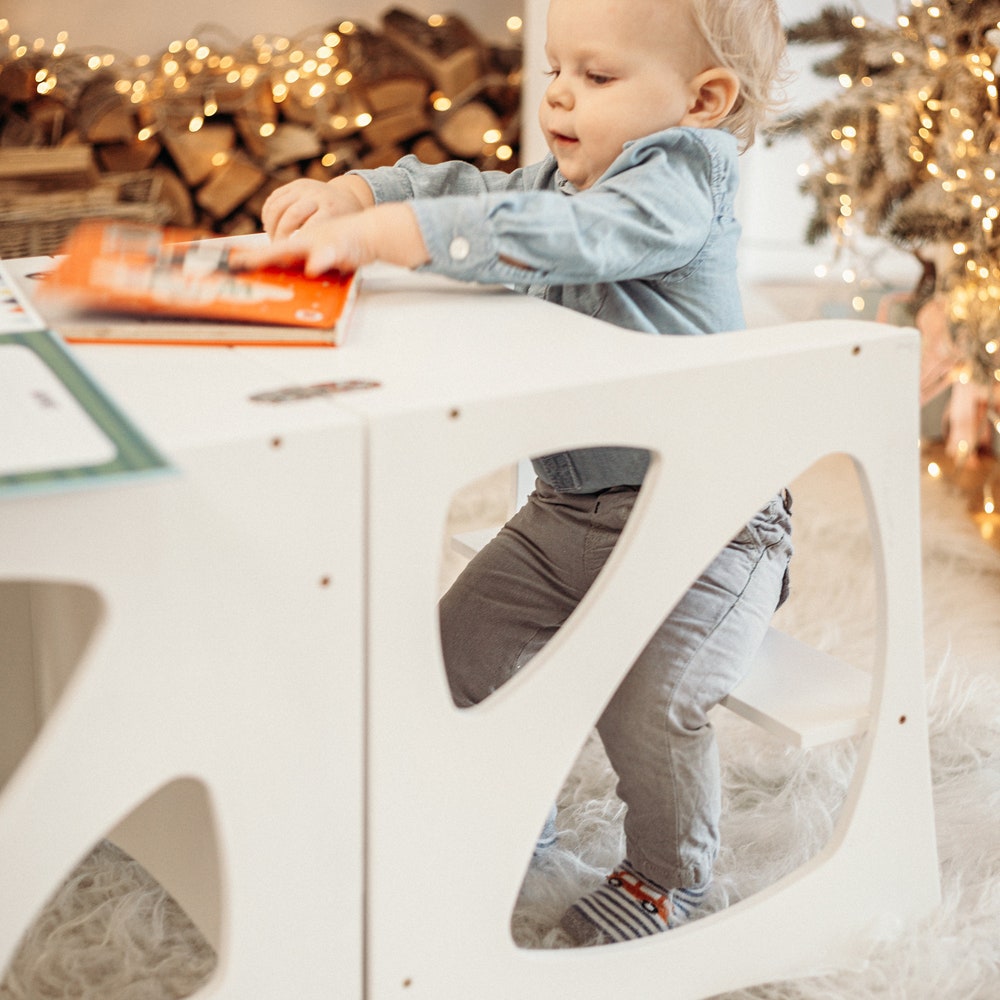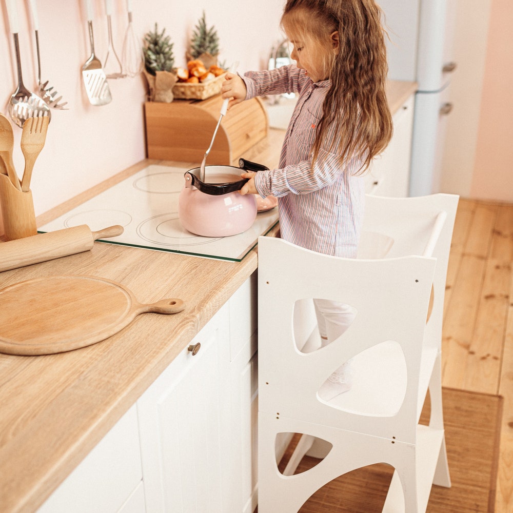 A helper tower, so your child can reach the kitchen counter or tabletops, can easily be transformed into a little chair with a table for play, drawings and other activities.