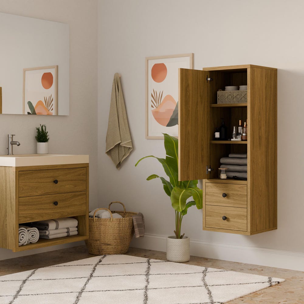 Arrives fully assembled at your door. Built from premium grade 3/4″ real White Oak veneer with a durable 1/2″ back, this bathroom storage cabinet is built for strength and longevity. We use formaldehyde free “PureBond” premium cabinet grade plywood by Columbia Forest Products.