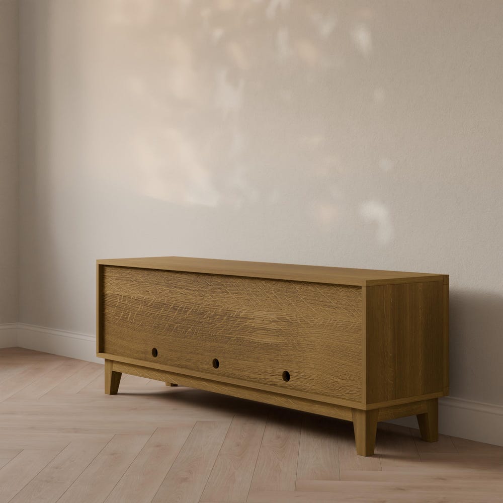 Arrives fully assembled at your door. Built from premium grade 3/4″ real White Oak veneer with a 1/2″ back, Solid White Oak face frame and legs, this Media Table is built for strength and longevity.